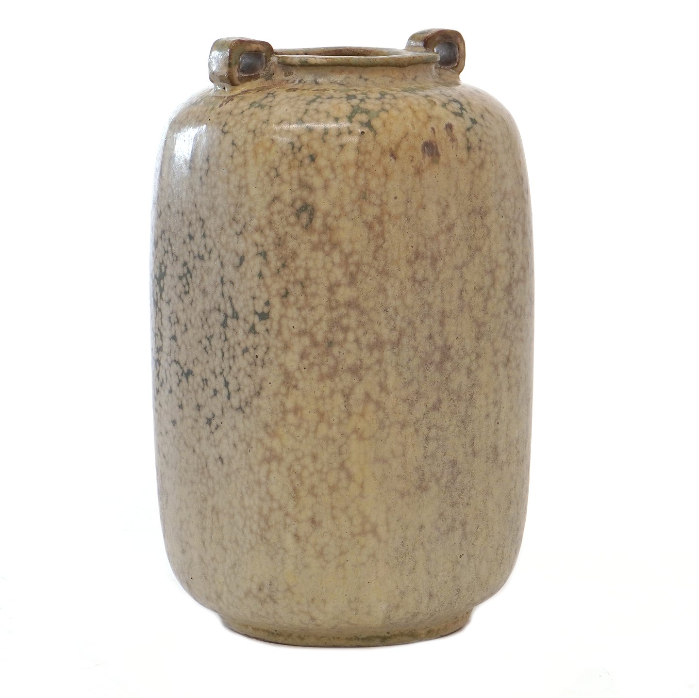 Arne Bang firesidet keramik vase med æggeskalsglasur og to små hanke model 121. Signeret. H: 16cm