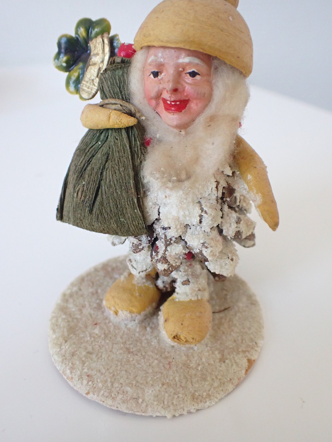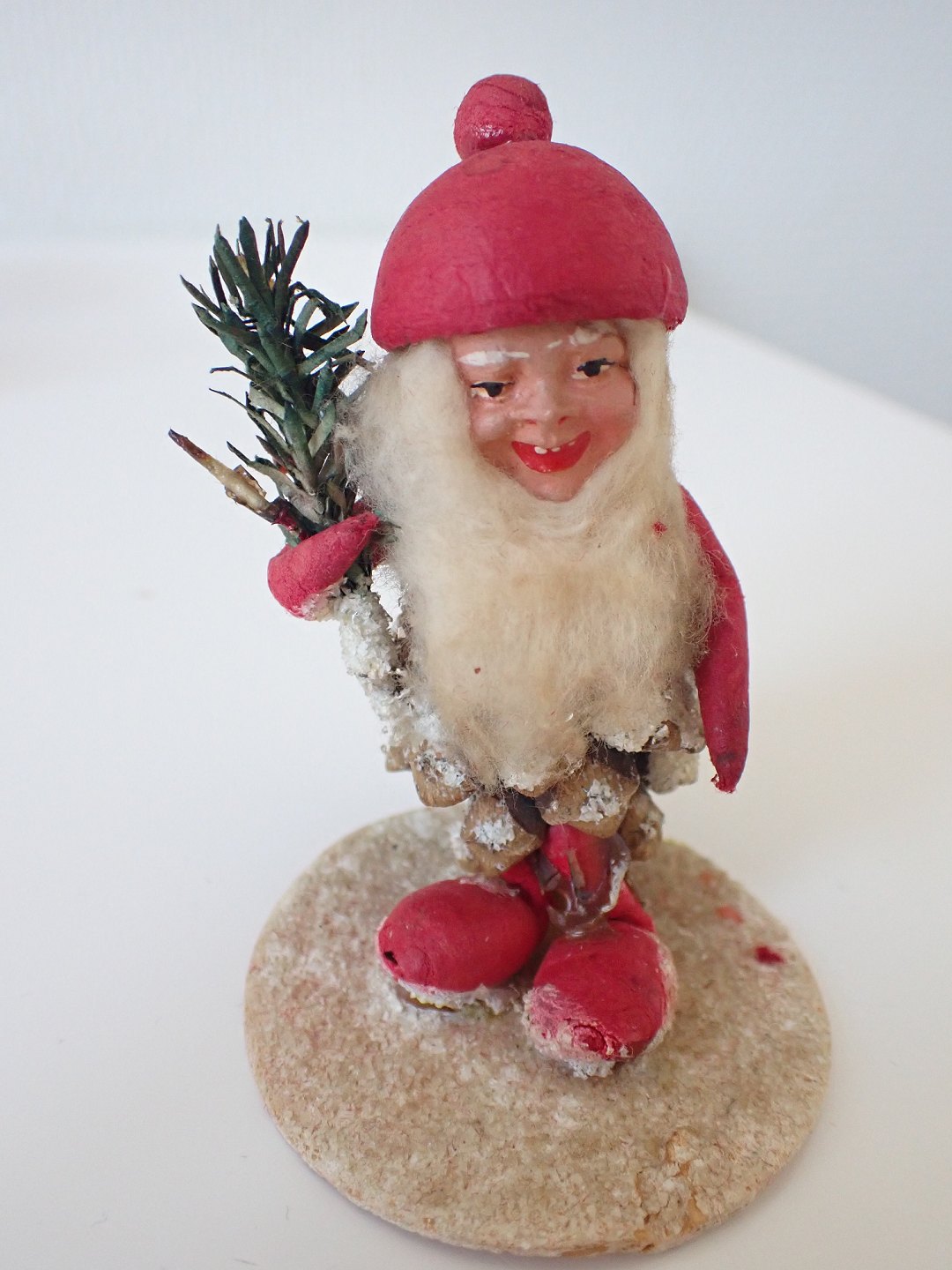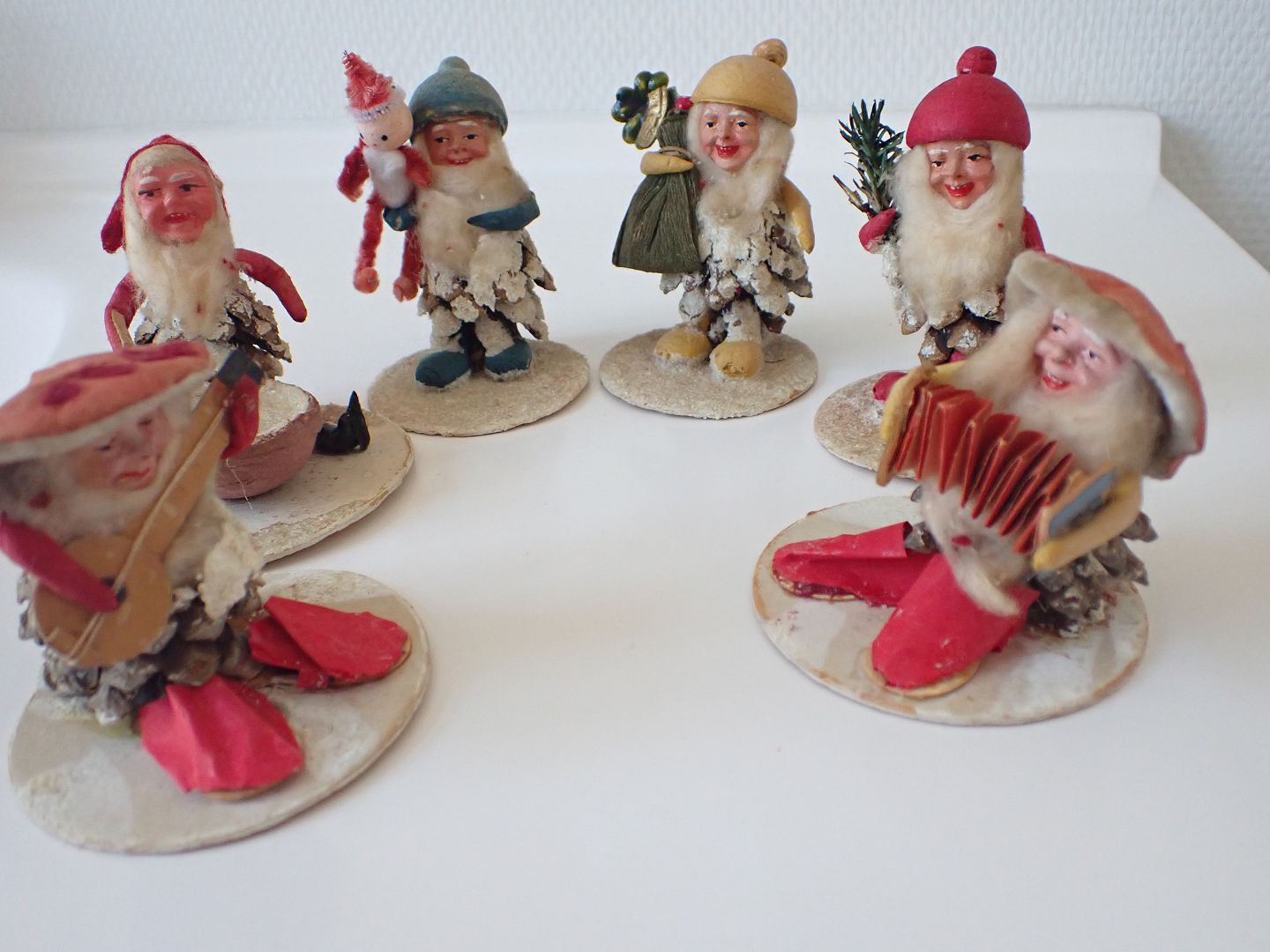 5 koglenisser med henholdsvis grangren, risengrød, piberensernisse, gavesæk, banjo og harmonika. Håndmalede, danske ca. 1930. Højde: 6,5 - 7,5 cm. I pæn tidstypisk stand.