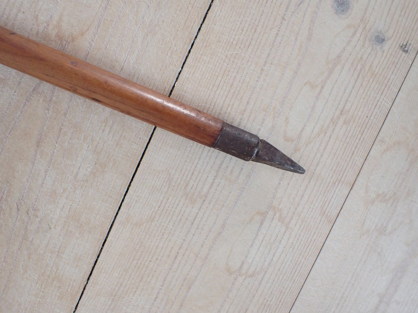 "Grand Tour" italiensk bjergstok formentlig i lakeret elm med greb af naturligt sort gedehorn. Spids dupsko af jern. Stokken eer påmalet Cortina. Ca. 1900. I pæn tidstypisk stand
