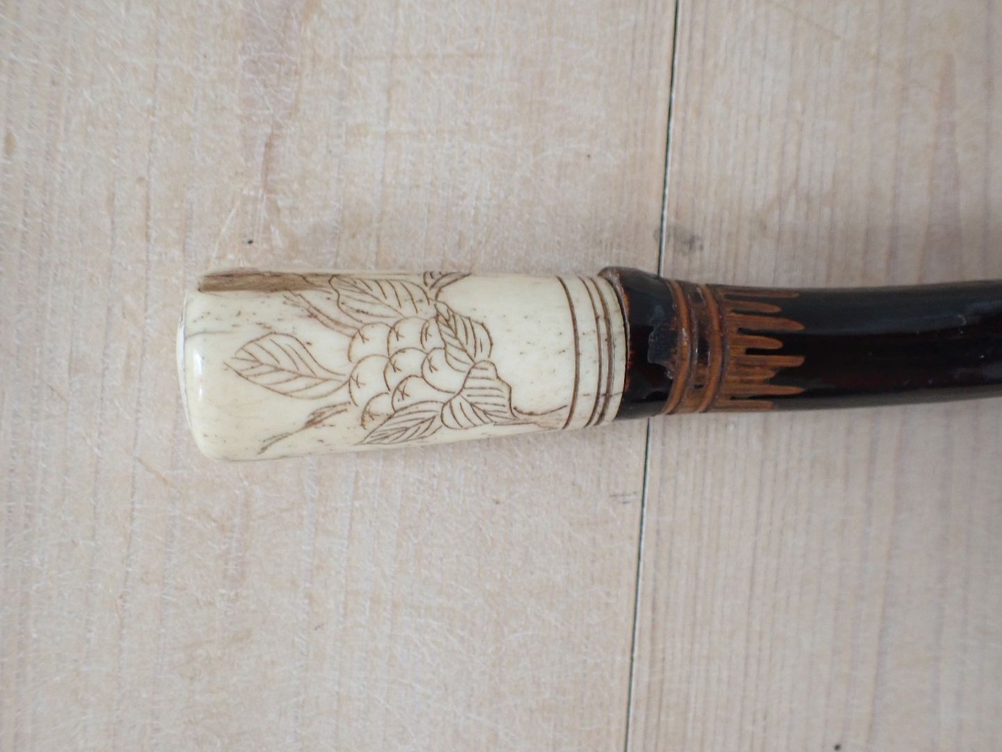 Japansk stok med knop i malet, udskåret bambus, med blomsterdekoreret knop af ben og med nyere dupsko af gummi. Udskæringerne på stokken fore stiller aber, en fisk og en snoende drage. Ca. 1920. Længde: 90,5 cm. I pæn stand o forhold til alder med let slid.