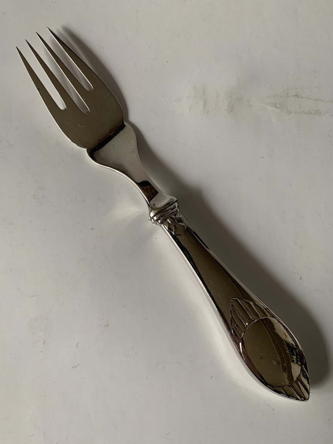 Wooden Spoon Fish Fork Silver. Stamped. Three towers. Length 18.4 cm. Used and well maintained. All cutlery is polished and packed in a bag