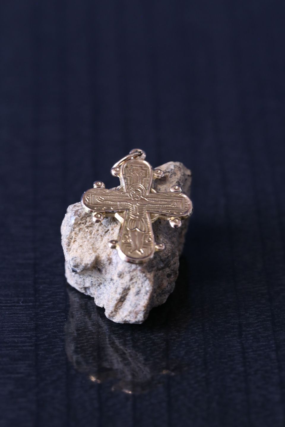 Klassisk Dagmarkors med den lidende Jesus på forsiden, og de 5 store på bagsiden. Dagmarkorset er et klassisk guldsmykke, der kan bæres af både mænd og kvinder.