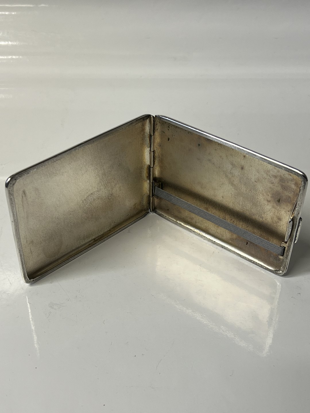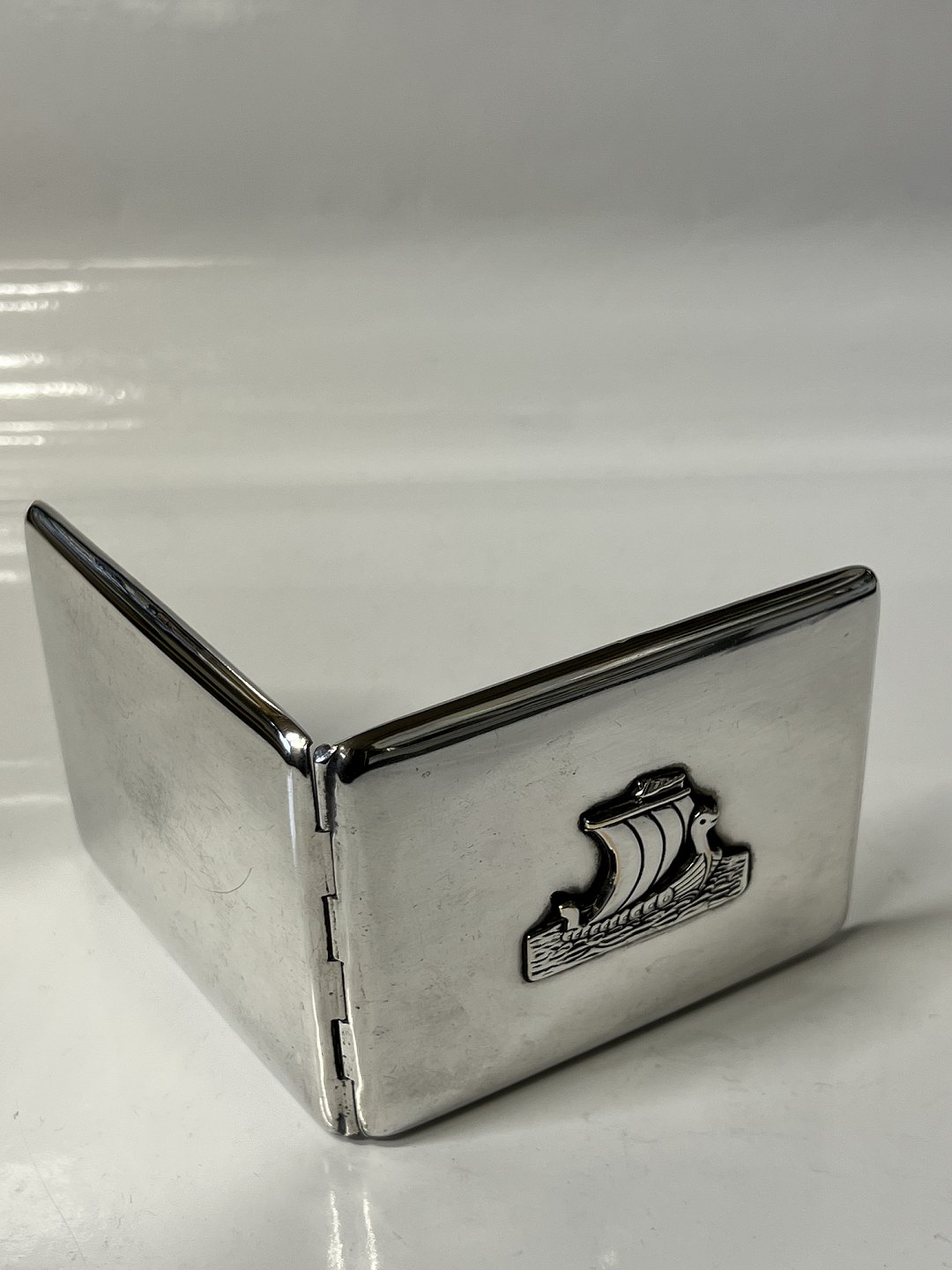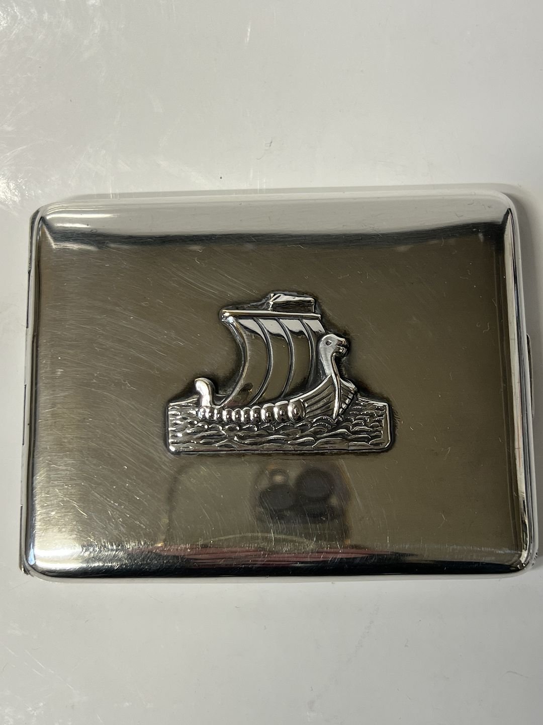 Cigaret etui / Kort etui Sølvplet med skibsmotiv Stemplet A.J.PLF Højde 8 cm Længde 10 cm Pudset og pæn stand
