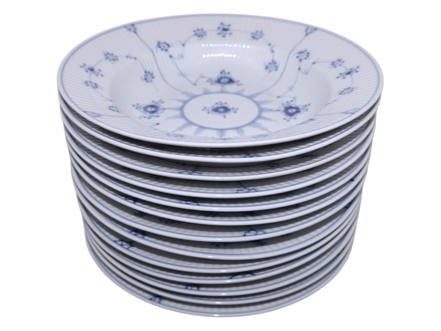 Royal Copenhagen Musselmalet Riflet, dyb tallerken. Dekorationsnummer 605. 2. sortering. Diameter 23,5 cm. Perfekt stand uden fejl.
