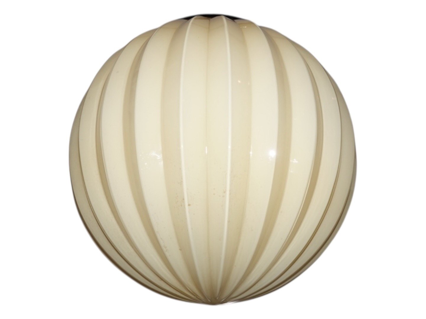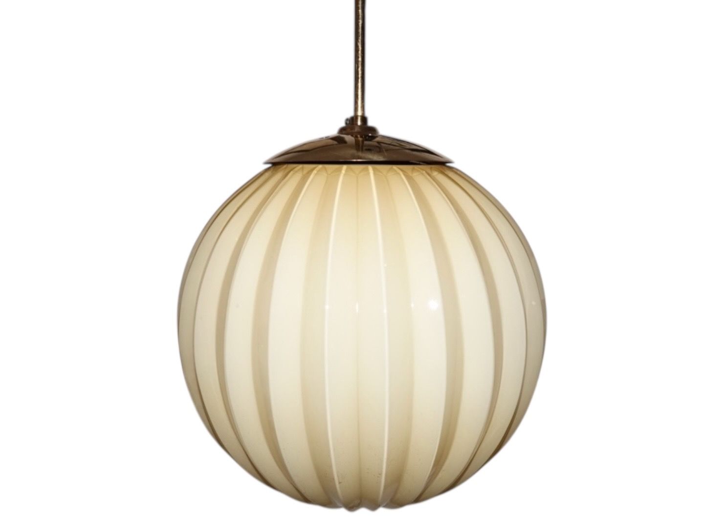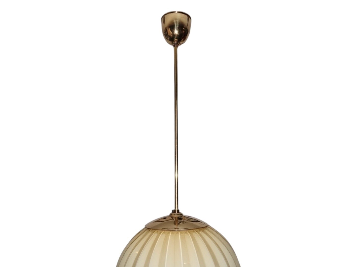 Art Deco loftslampe i cremefarvet rillet glas med messing stang. Lampen er fra omkring 1940. Diameter 28 cm., højde med stang 82 cm. Flot og velholdt stand.