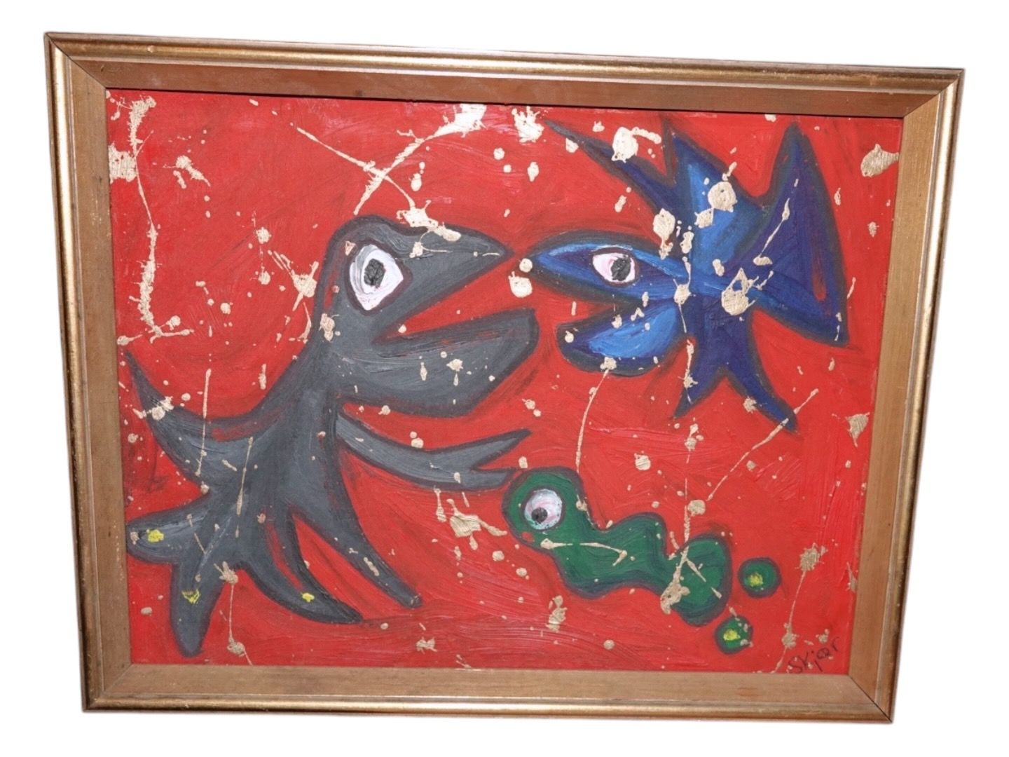 Susanne Kjær, moderne rødt oliemaleri med fisk.