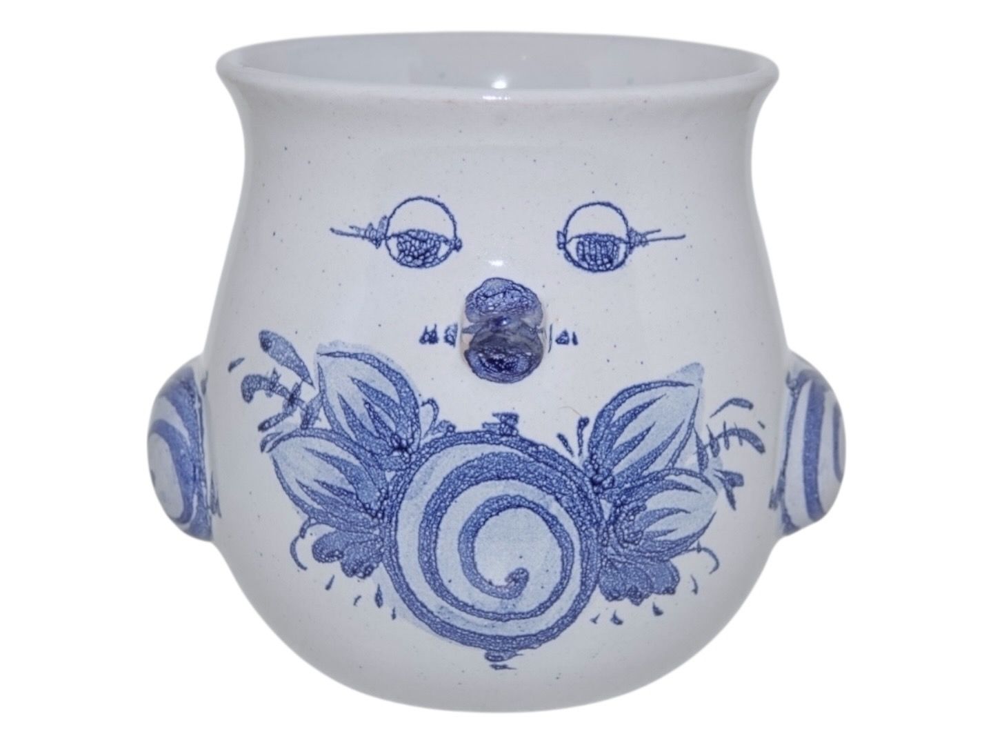 Bjorn Wiinblad art pottery, small blue flower pot shaped as a bird with beak, wings and a tail.