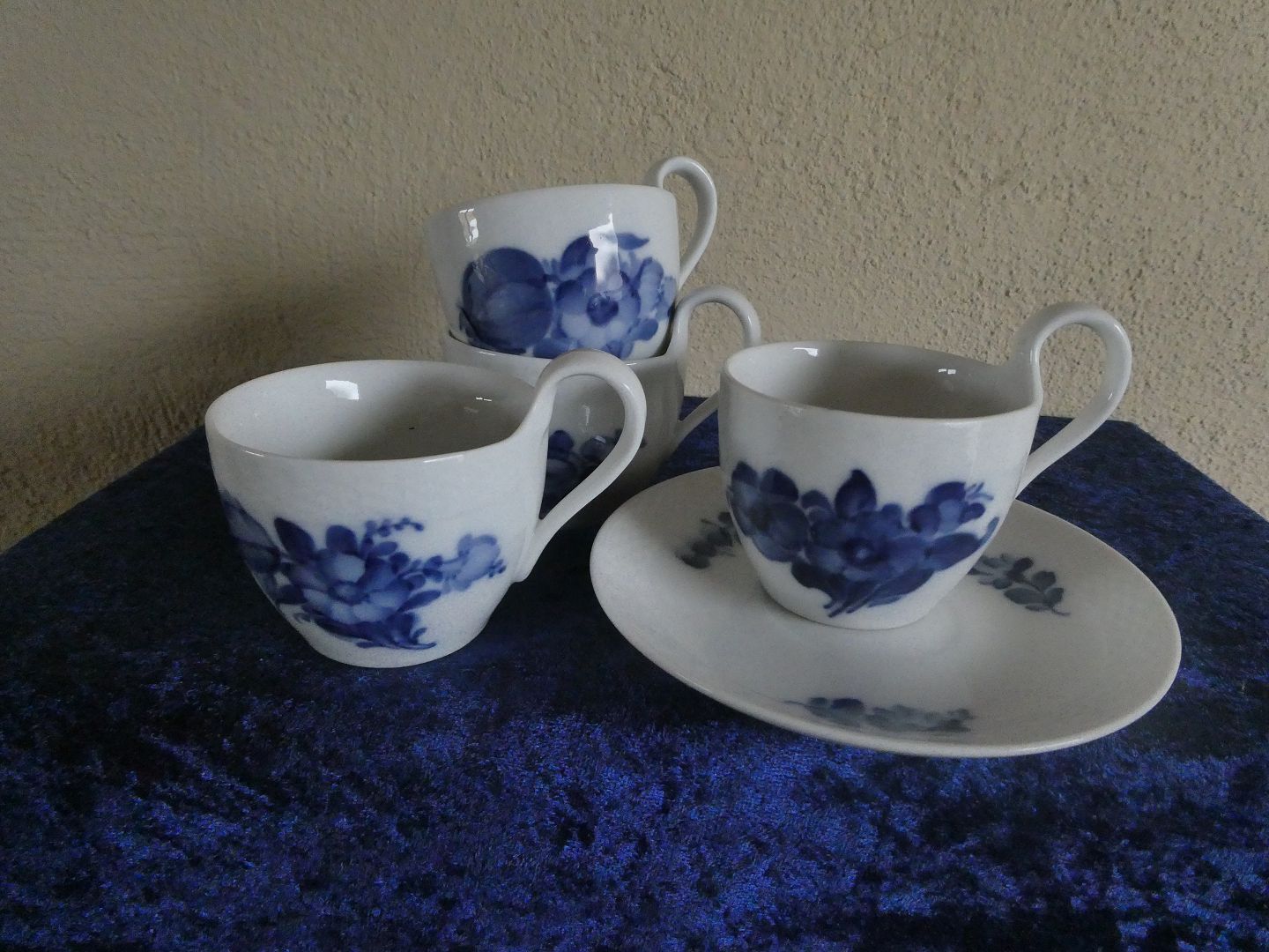 Set of 4 high-handled cups No 8193 of 1st quality + 1 saucer of 2nd quality. All pieces are in a good, used condition.