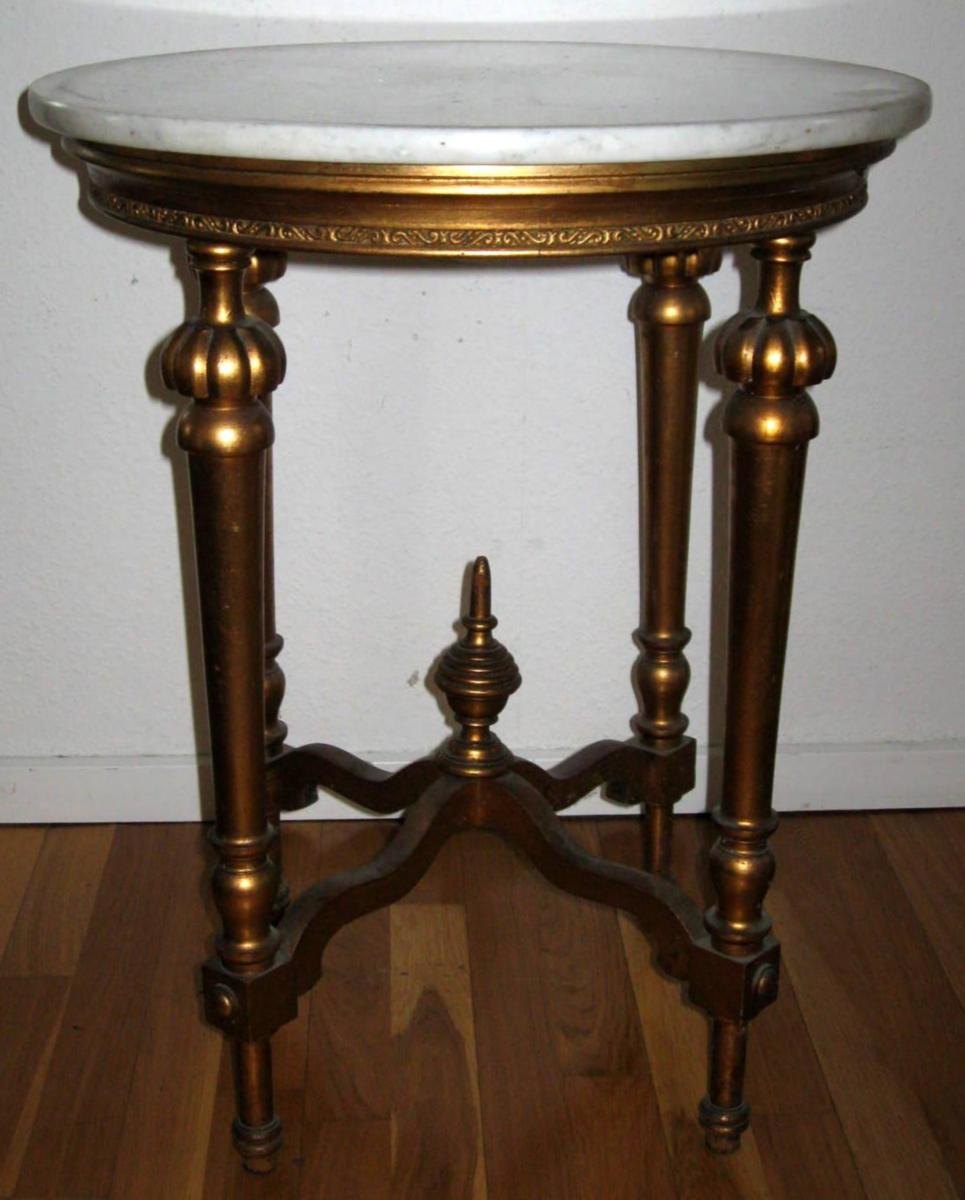 Fransk forgyldt bord med lys marmorplade, 19. årh. Drejede ben med dekoratiner. Kantdekoration. H.: 72 cm. Dia. plade.: 58 cm.