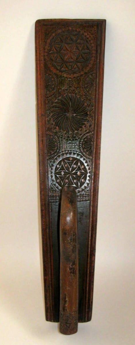 Dansk manglebræt, 19. årh. Med hestegreb og karvskæringer. Dateret 1824. Grøn- og rødmalet. L.: 61 cm. Med reparation. Proveniens.: Østjylland.