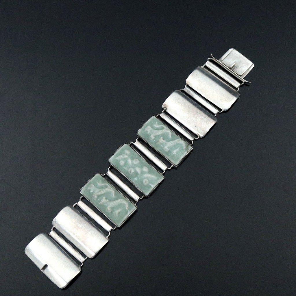 Jais Nielsen 1885-1961. Armbånd i sterling sølv med keramik med celadon glasur.
