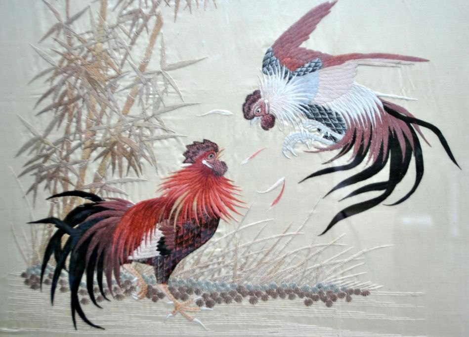 Kinesisk silkebroderi, 20. årh. To kæmpende haner.
