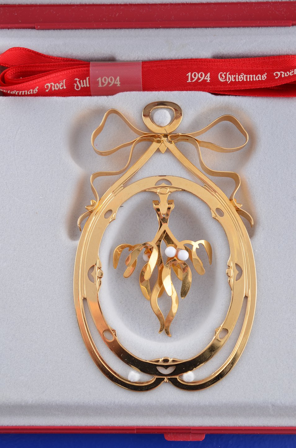 Georg Jensen Julepynt. Juleuroen år 1994 med mistelten motiv, forgyldt messing. Designet af kunstneren, Jette Frölicb. Pæn velholdt stand, med æske.
