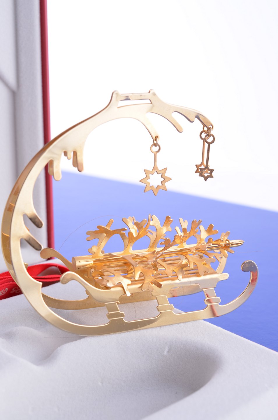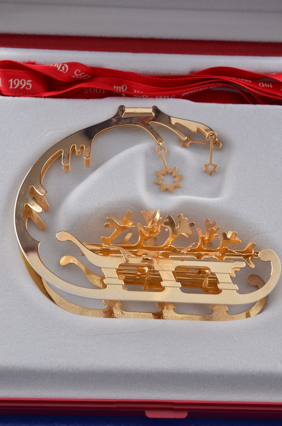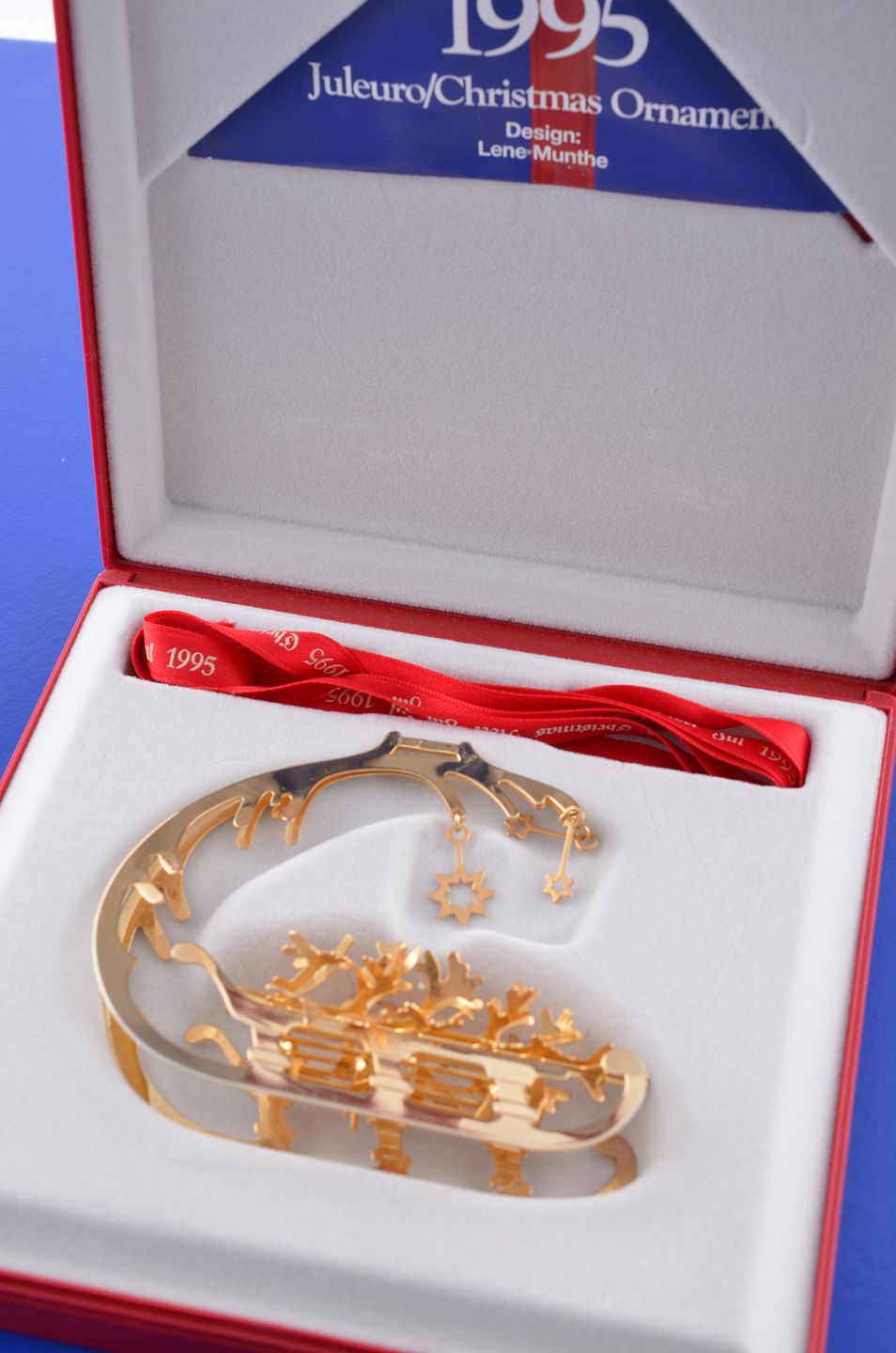 Georg Jensen Julepynt. Juleuroen år 1995 med juleslæde motiv, forgyldt messing. Designet af kunstneren. Lene Muntbe. Pæn velholdt stand, med æske.