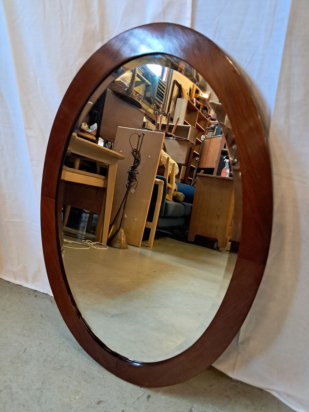 Ovalt spejl i fineret mahogni, fra 1930erne.
