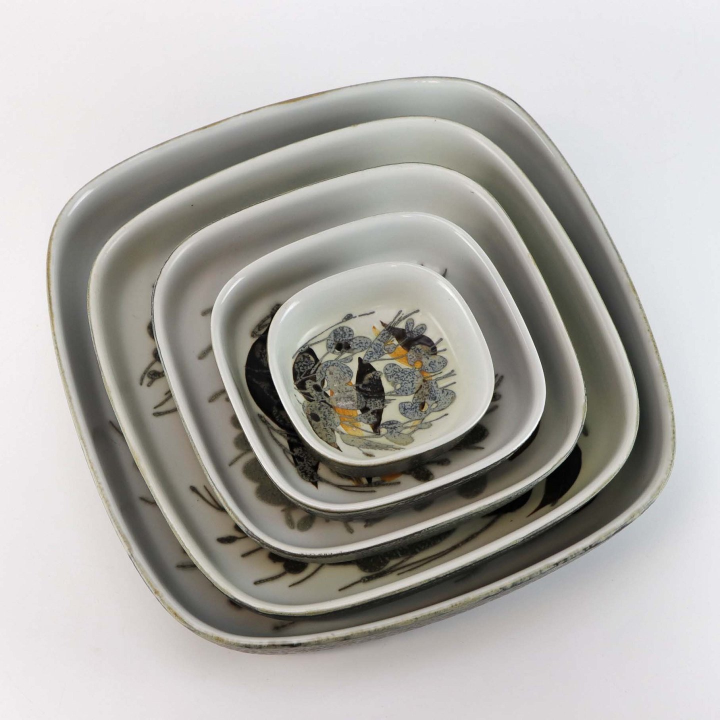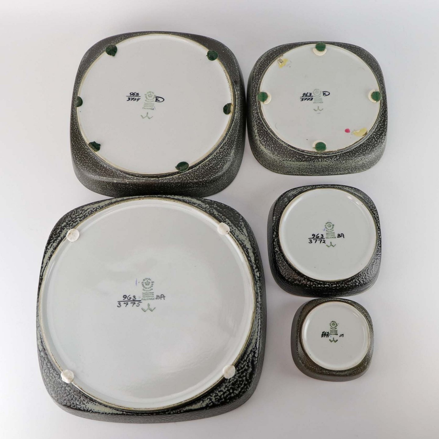 Fade i fajance i fem forskellige størrelser fra Baca serien. Fadene har en firkantet form med abstrakt mønster i hvide og brunlige nuancer. Nr. 963/3771. Nr. 963/3772. Nr. 963/3773. Nr. 963/3774 og Nr. 963/3775