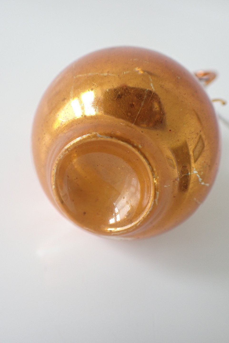 1 Stk. glasjulepynt - 2 hanket lågvase i guldbronze med sølvdekoration. Med ophæng og kan stå. Stammer fra Leipzig tidlig 1900-tal. Højde: 7,2 cm. Bredeste diameter: 4,3 cm. I fin stand.