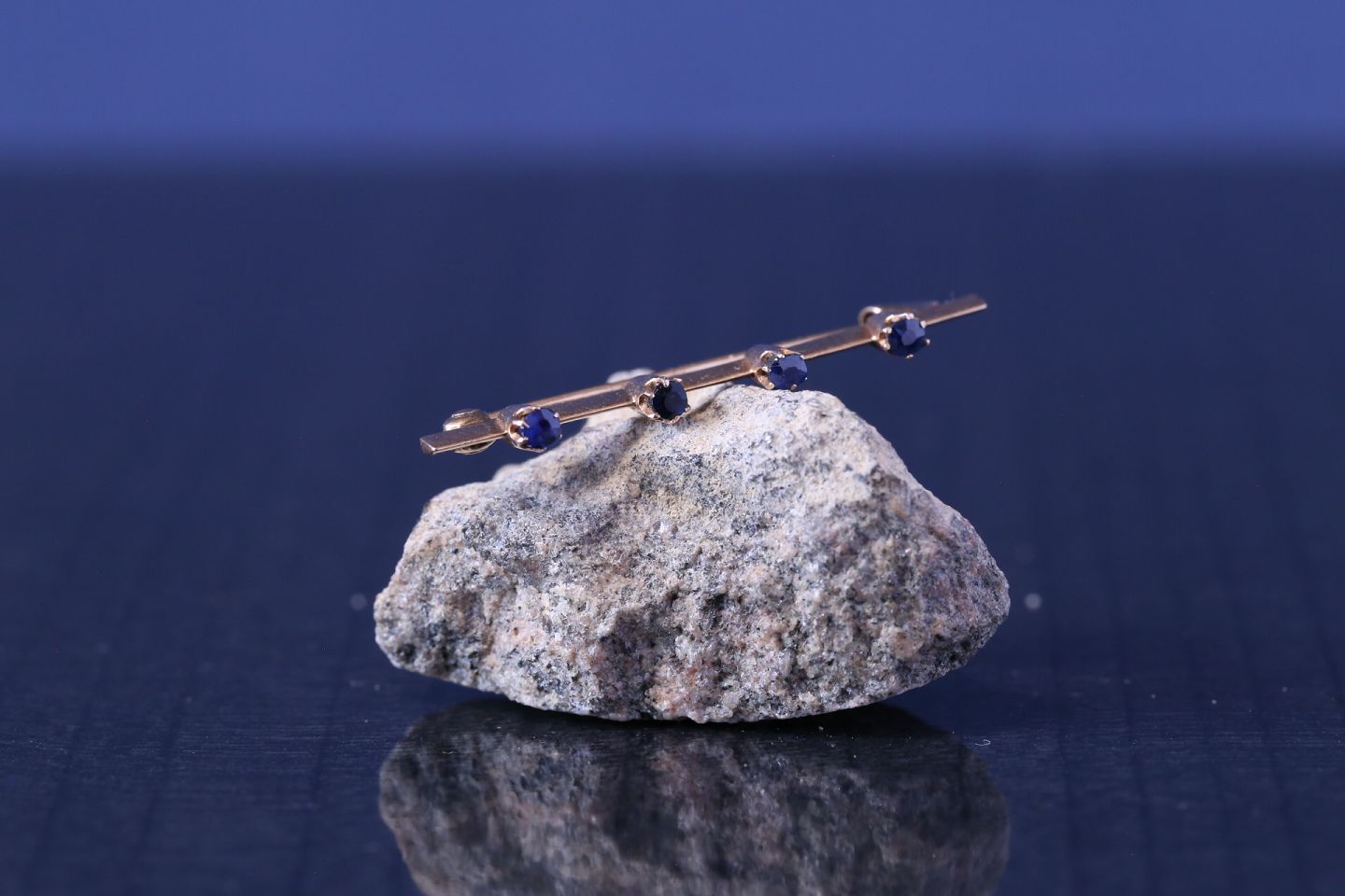 Gold brooch in 14 karat gold, with 4 blue sapphires, stamped 585.