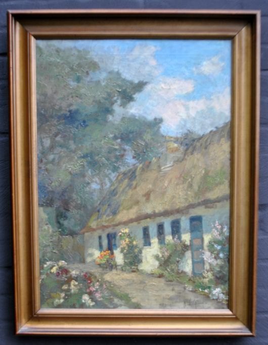 Pedersen, Hugo V. (1870 - 1959) Danmark: Blomster foran et hus. Olie på lærred. Signeret. 69 x 50 cm.