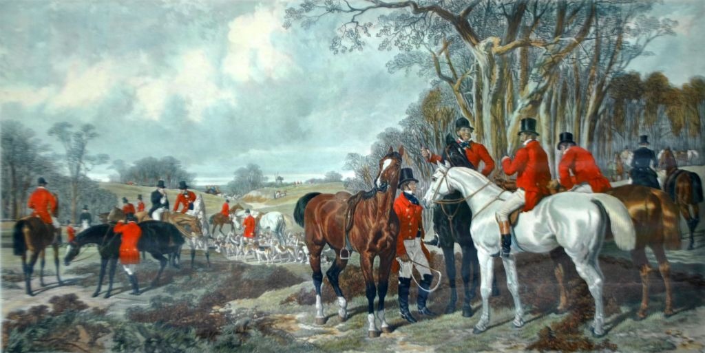 Engelsk kunstner (19. årh.): Fox-hunting, Plate 1 "The Meet", 1852, London, England. Håndkoloreret litografi