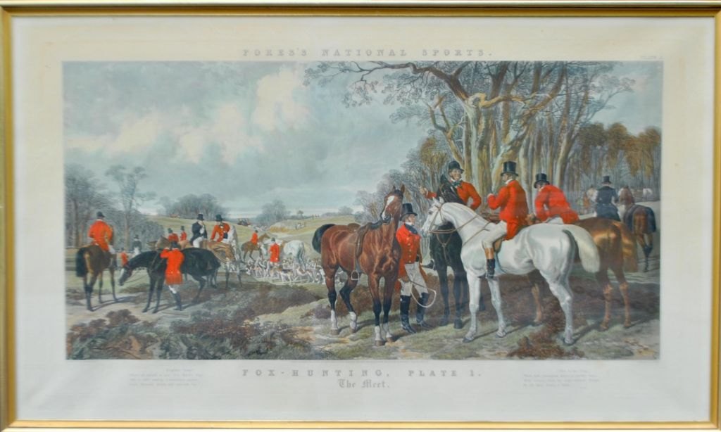 Engelsk kunstner (19. årh.): Fox-hunting, Plate 1 "The Meet", 1852, London, England. Håndkoloreret litografi. Efter John Frederick Herring d. ældre (1795-1865). Graveret af J. Harris (1808-1846). Trykt af Fores til deres National Sports serie. Med signaturer og digt. H: 62 cm. B: 107 cm.