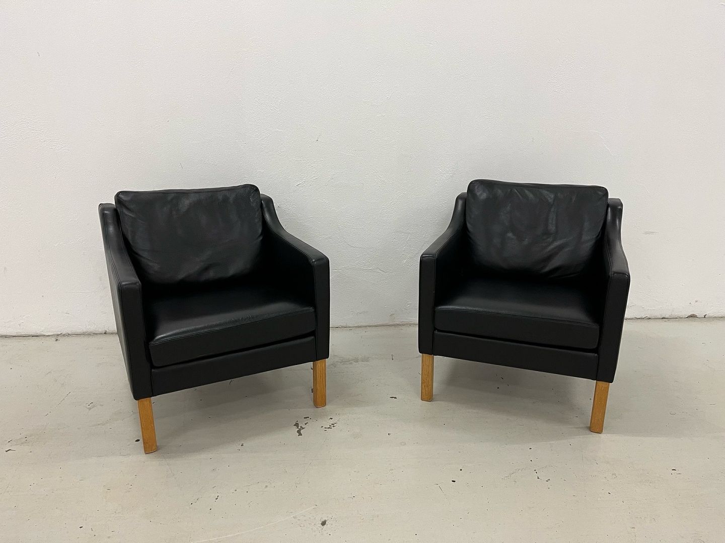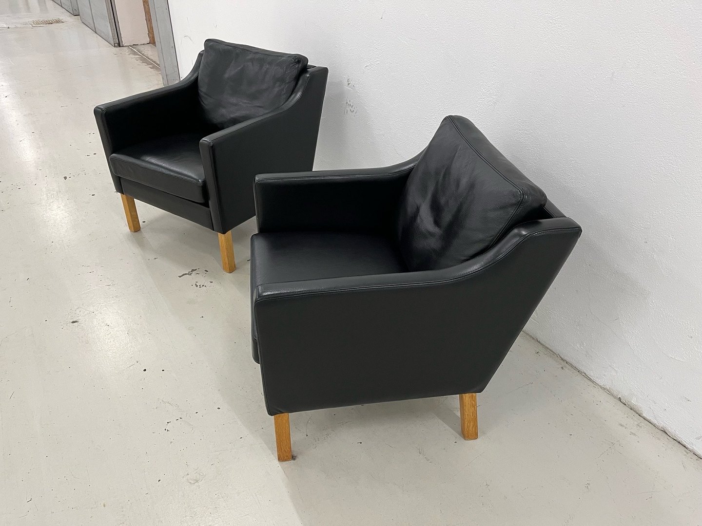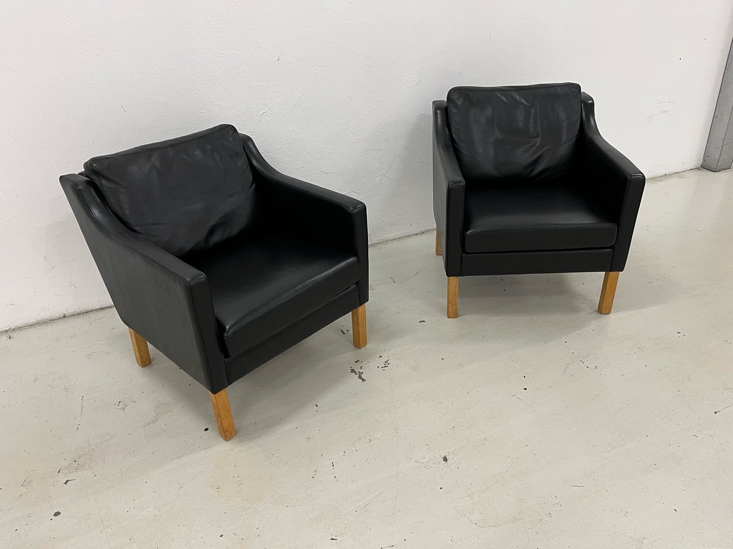 Nielaus lounge stole mærke Jeki special designet i sort semi anilin læder Living 5377 og med ben i olieret Eg. Nypris 40.000,-