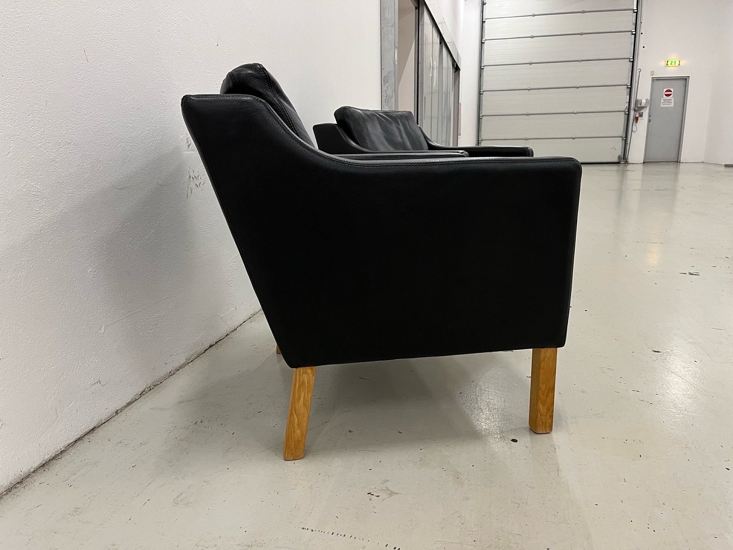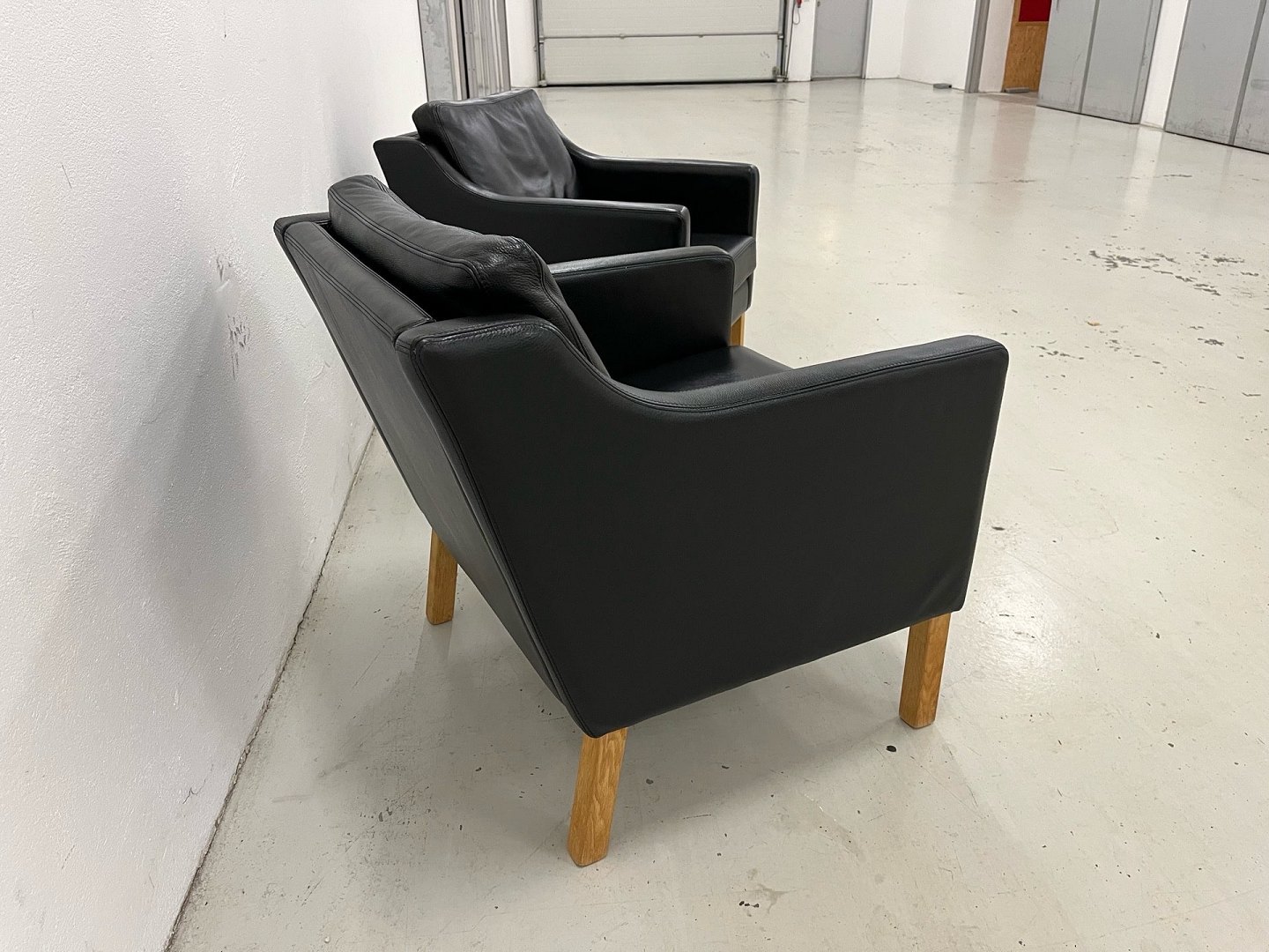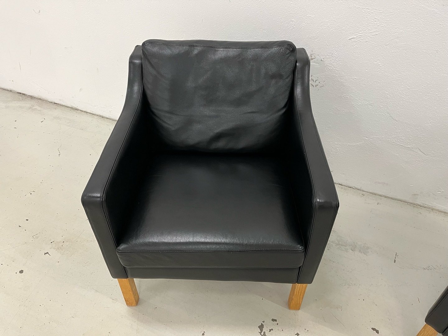 Nielaus lounge stole mærke Jeki special designet i sort semi anilin læder Living 5377 og med ben i olieret Eg. Nypris 40.000,-