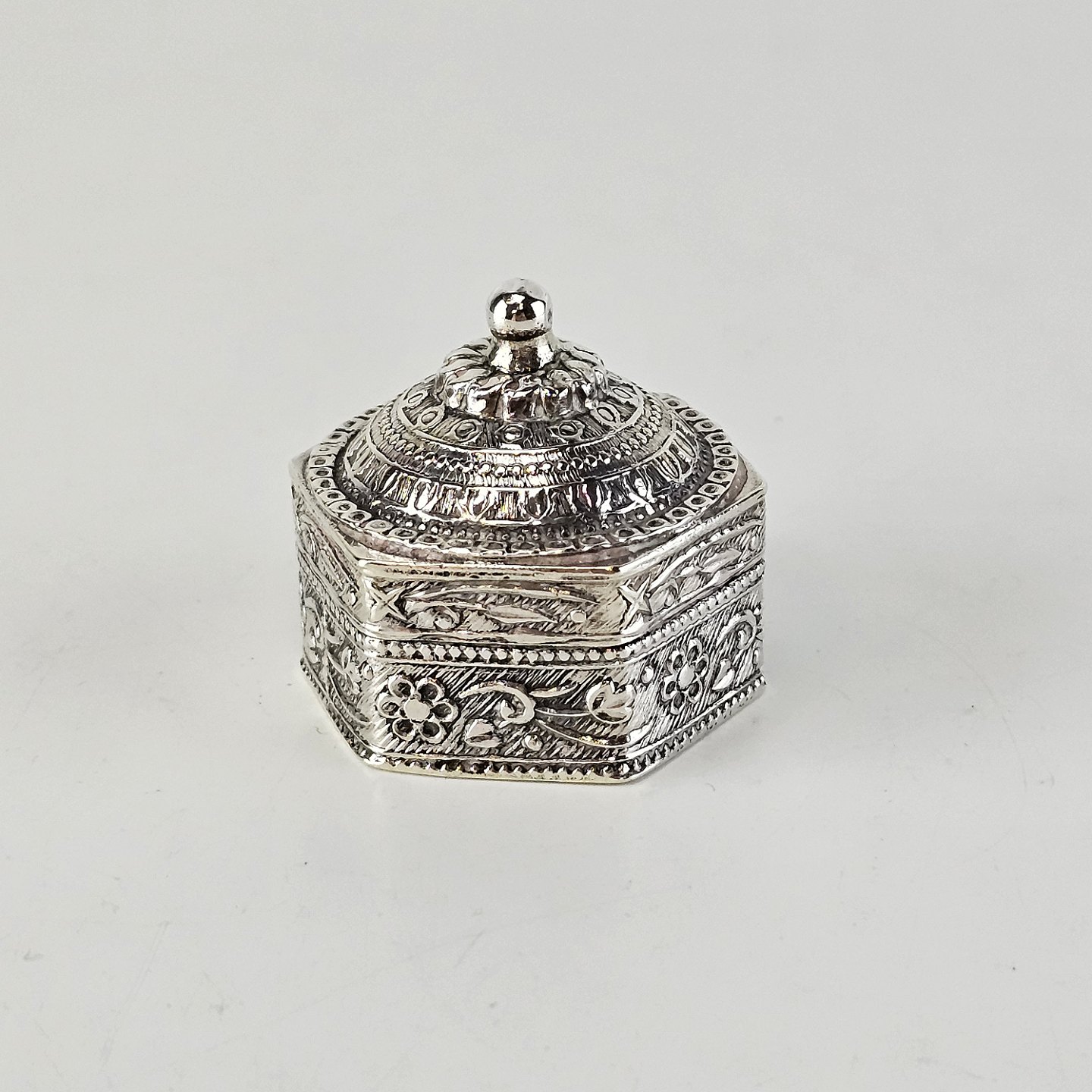 Lille dåse i sølv med koppellåg og dekoreret med blomsterranker