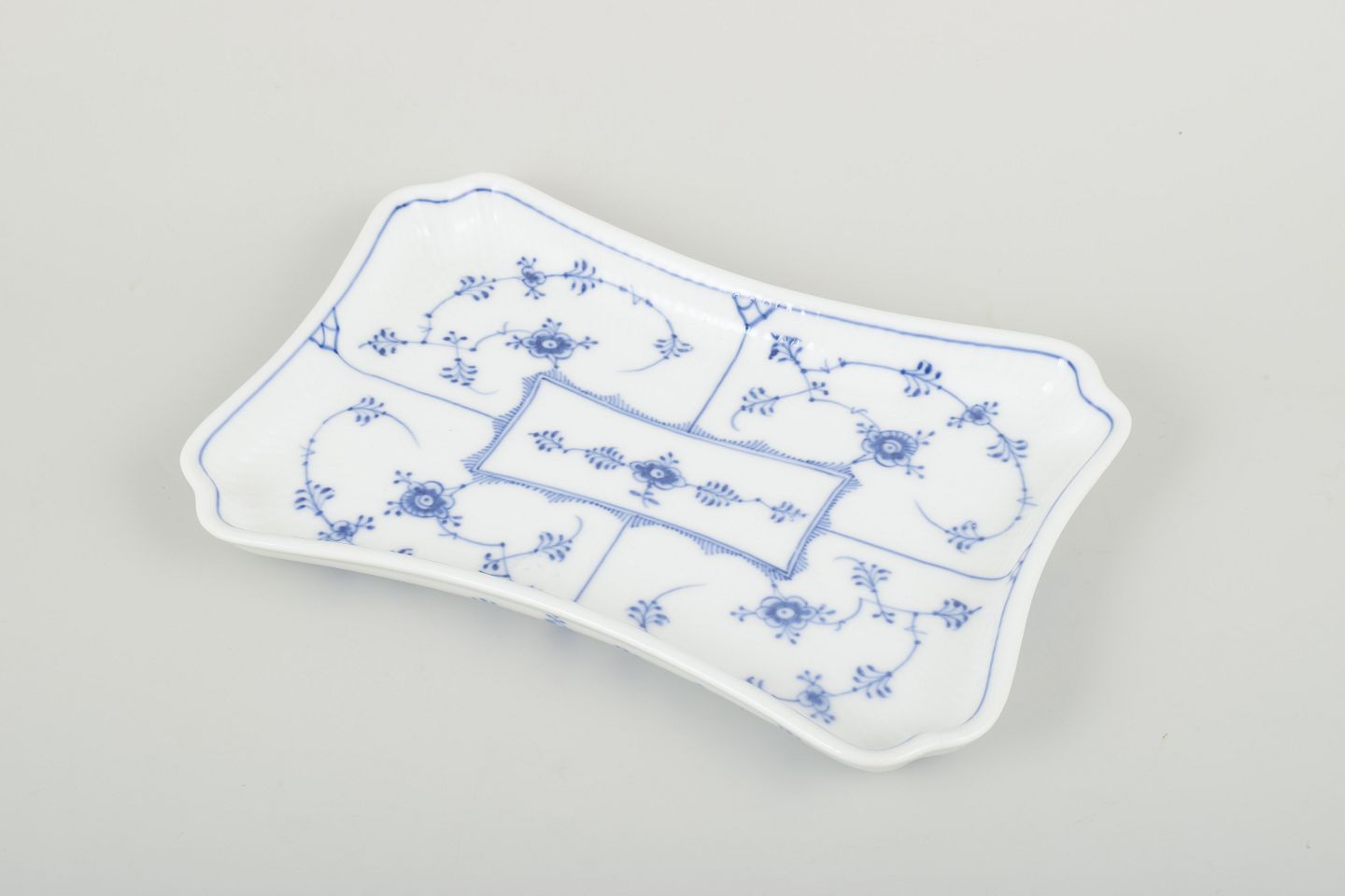 En klassisk serveringsbakke fra Royal Copenhagen i det ikoniske musselmalede Riflet-mønster, håndmalet med elegant blå dekoration. Formen er let svunget med markeret kant, velegnet både som brugskunst og dekorativt indslag i samlingen.