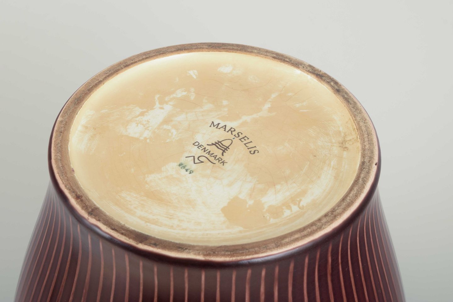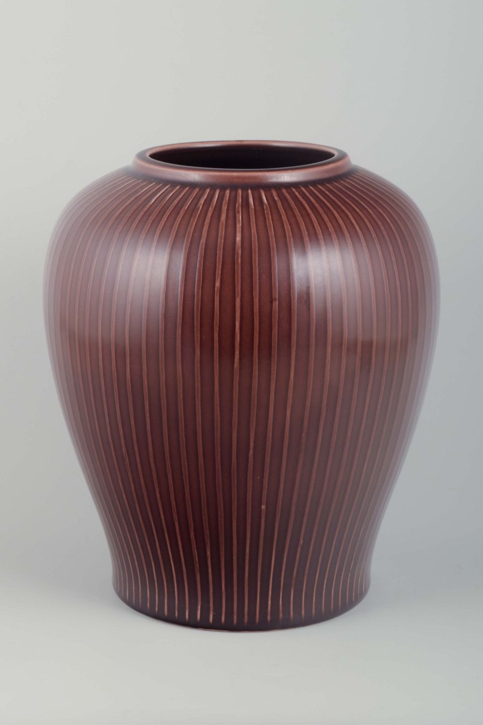 Marselis-serien fra Aluminia er kendetegnet ved en enkel, tidløs æstetik, hvor den burgundy glasur og reliefarbejdet fremhæver det håndværksmæssige udtryk. Serien repræsenterer den skandinaviske keramiske tradition med vægt på både funktionalitet og kunstnerisk form.
