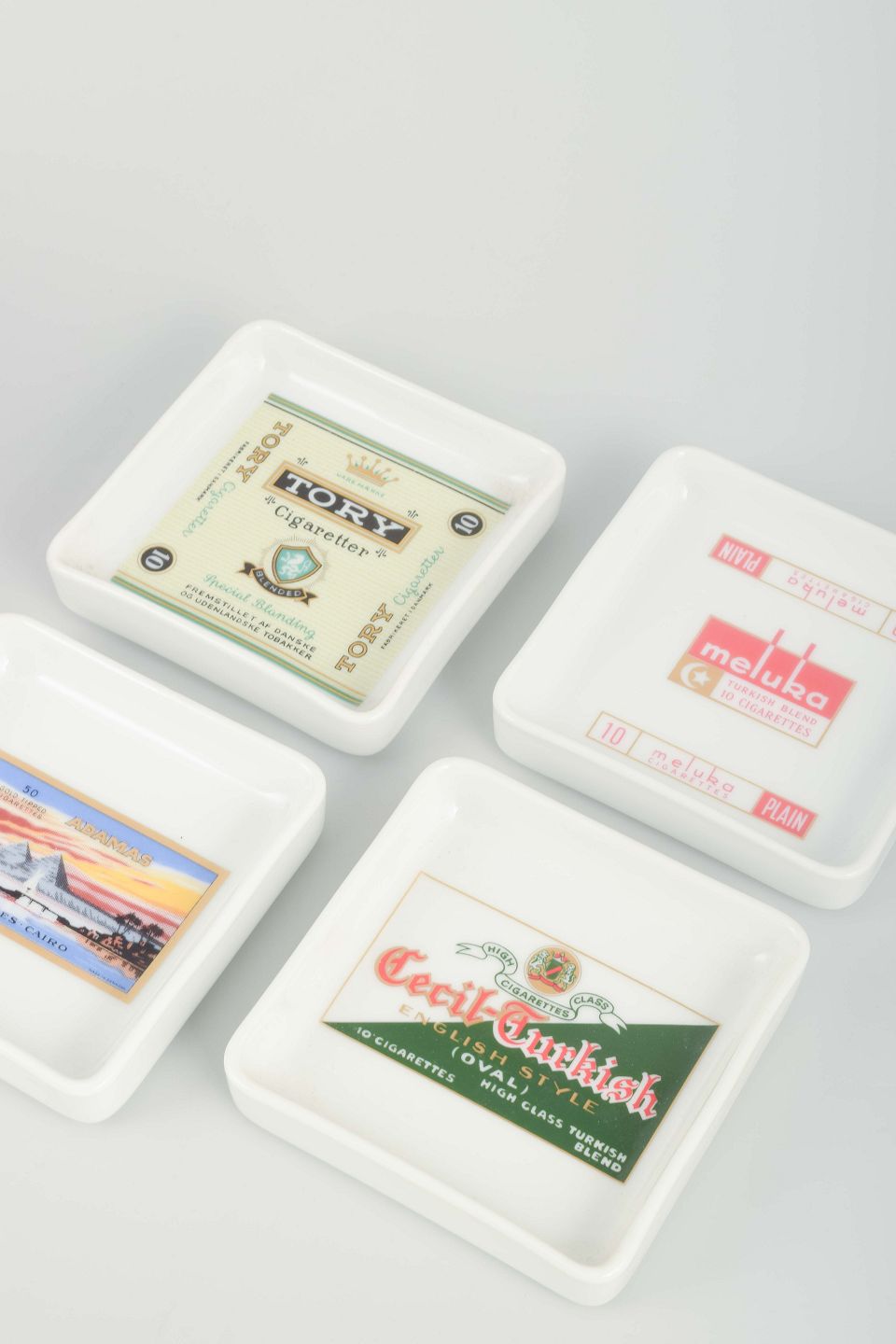 Sæt med fire kvadratiske porcelænsaskebægre, hver dekoreret med klassiske tobaks- og cigarmotiver. Leveres i originale æsker.