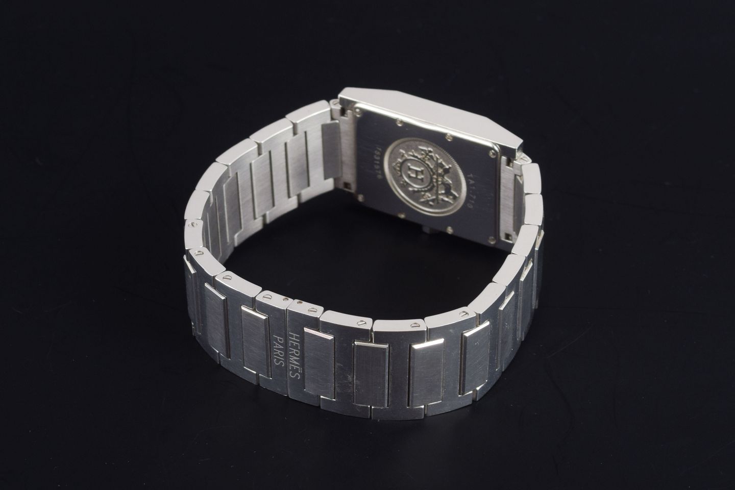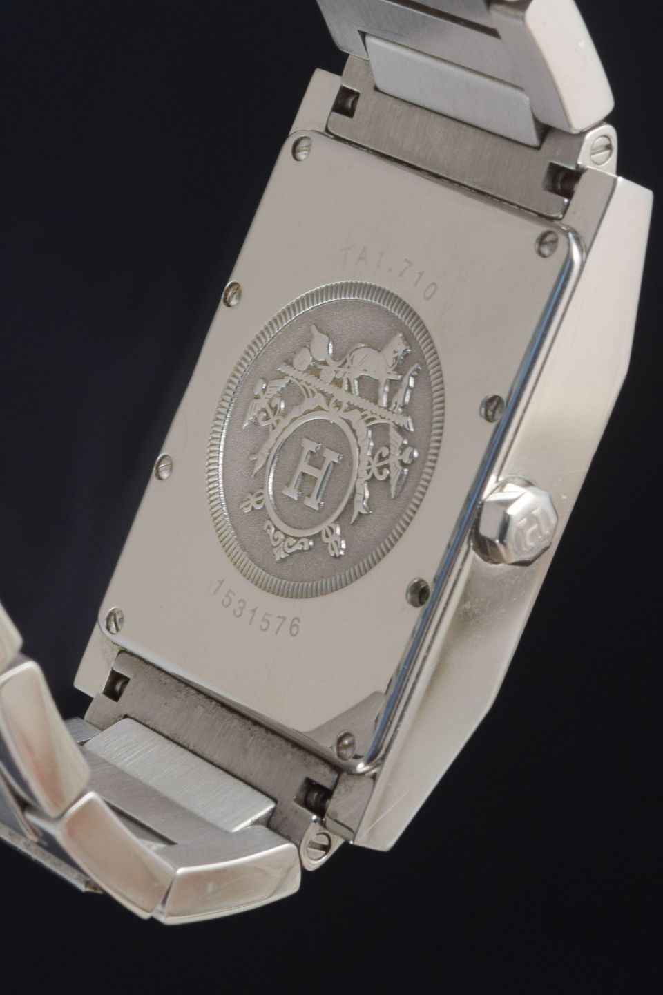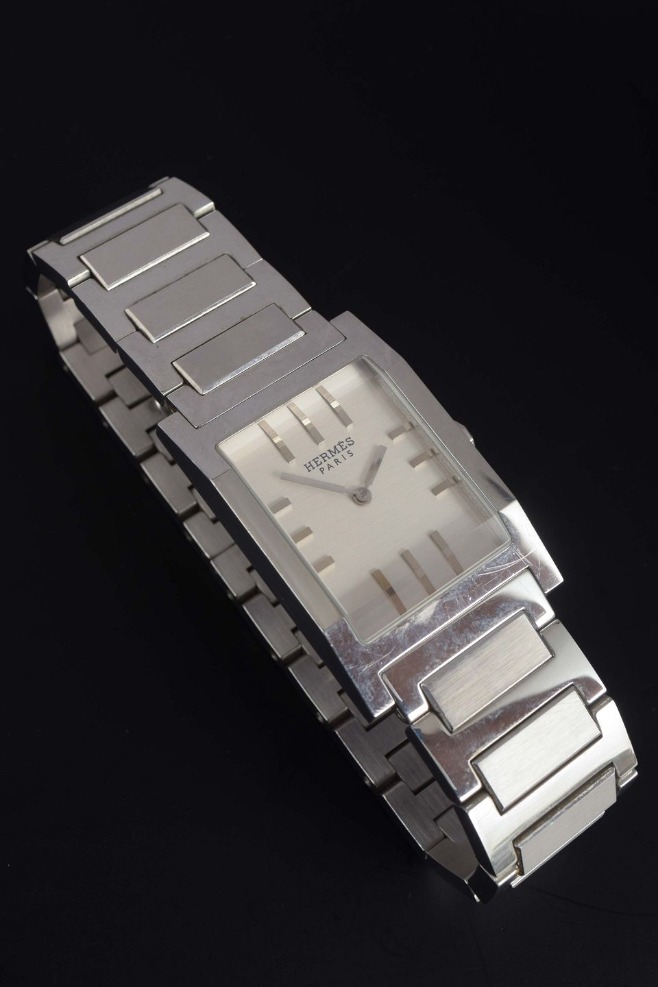 Hermès, grundlagt i 1837 i Paris, er internationalt kendt for sit udsøgte håndværk og luksusvarer inden for læder, mode og accessories. I 1970’erne begyndte Hermès at producere ure i Schweiz, kendetegnet ved kombinationen af fransk design og schweizisk urmagermesterkvalitet. Tandem-modellen, introduceret i 1990’erne og produceret ind i 2000’erne, udmærker sig ved sit moderne rektangulære design med integreret lænke og minimalistisk udtryk, som gør den til et tidløst herreur.