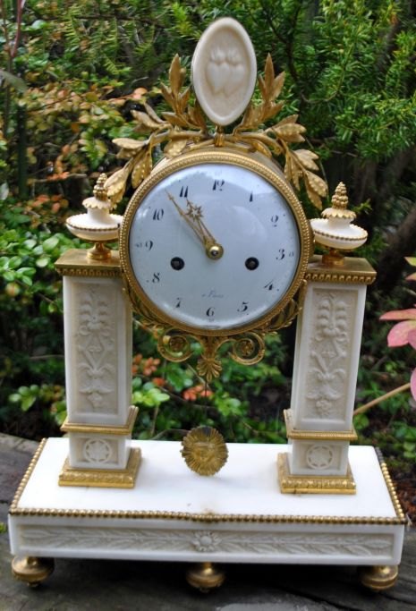 Fransk søjleur af forgyldt bronze og hvid marmor, empire, ca. 1830. Søjler og fod med dekoration. Urhus dekoreret med bladværk i forgyldt bronze. Øverst marmor plaquette med to hjerter i brand. Standart urværk med klokke. Skive i hvid emalje med araber tal. Med pendul med sol.H. cm. B.: 31 cm. D.: 12 cm. : 43