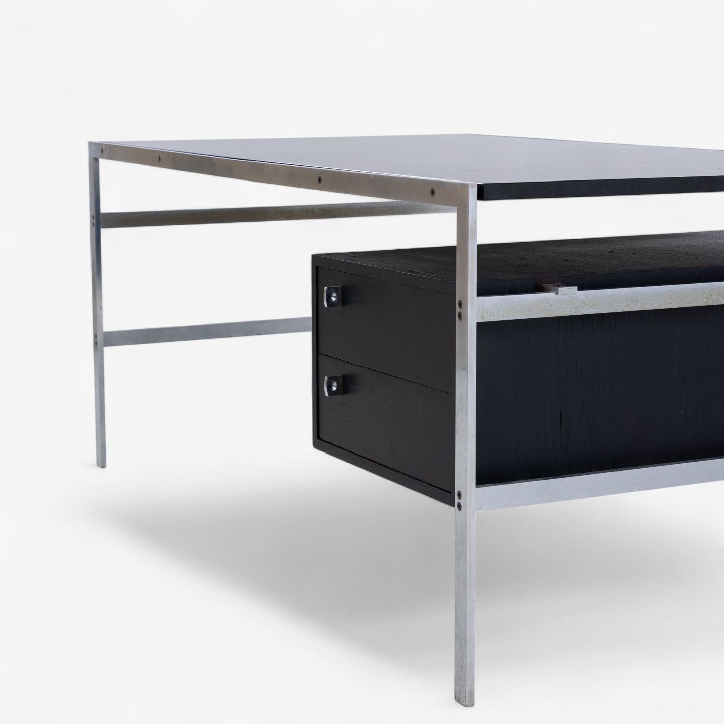 BO 550 - Skrivebord i stål med plade i 'Nero Assuloto'-granit med skuffemodul i sort wengé.