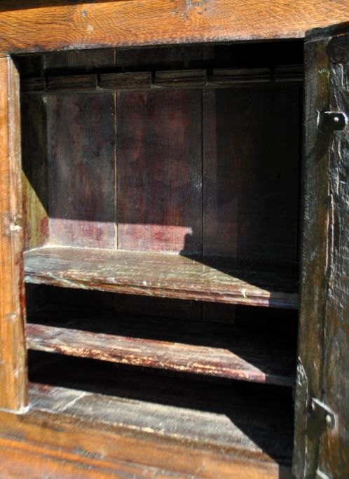 Antikt dansk barokt hængeskab i egetræ, 1700-tallet midte. Med antik lås og nøgle. Frontlåge med udskæring af De hellige Tre konger. Indvendig med to hylder og en skehylde foroven. H.: 70 cm., B.: 61 cm. D: 26 cm.