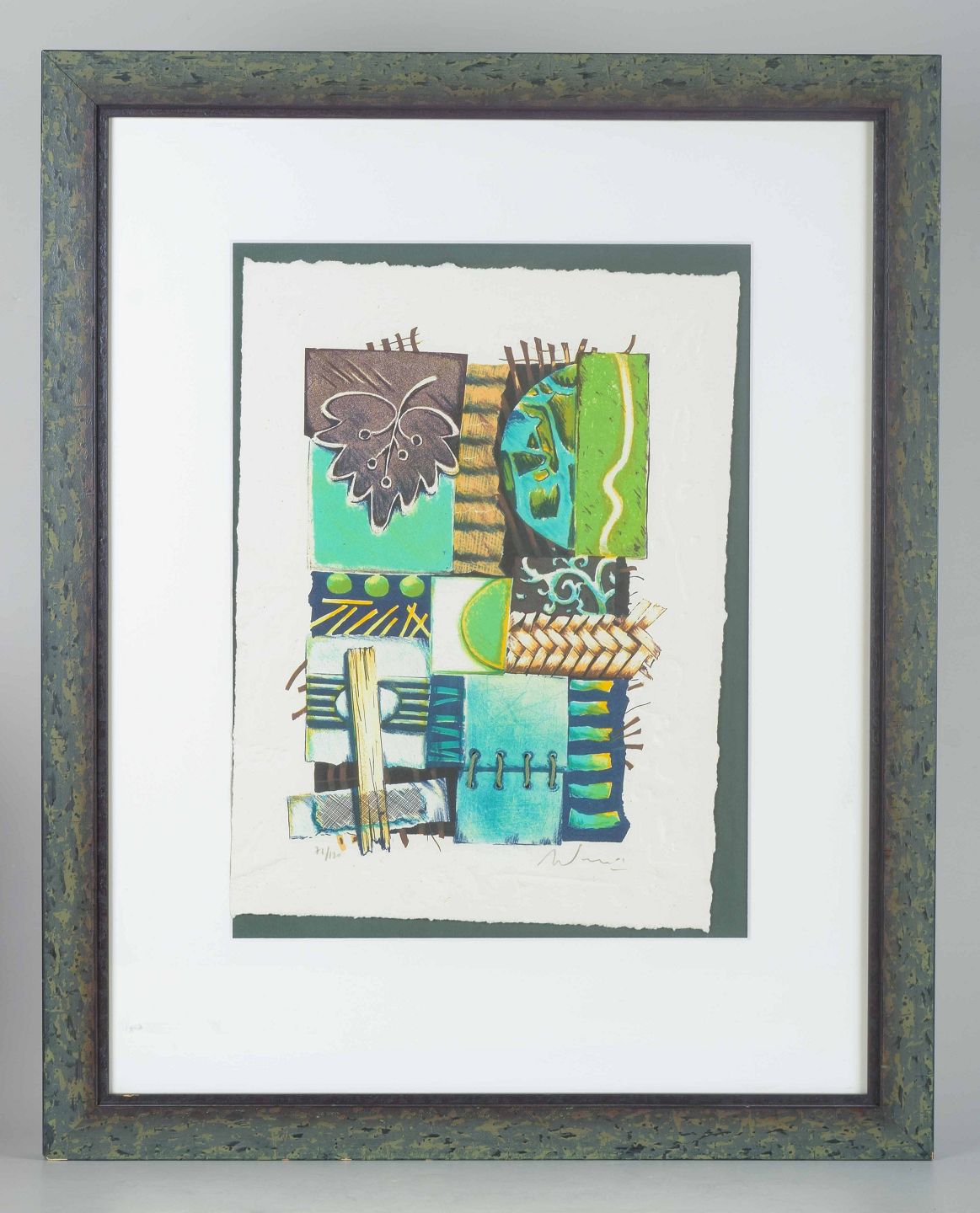 Et farverigt og dynamisk litografi, hvor geometriske og organiske former sammensættes i et patchwork-lignende mønster. De blå, grønne og jordfarvede toner skaber en rytmisk og teksturel helhed, hvor elementer som blade, vævede strukturer og dekorative linjer flettes ind i hinanden. Værket bærer præg af Soucasses interesse for balance mellem naturinspirerede symboler og en mere konstruktiv, abstrakt billedopbygning.