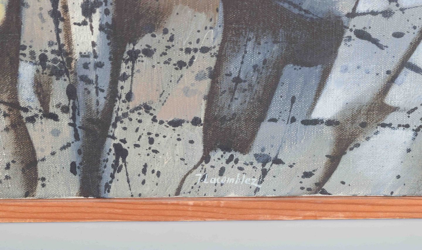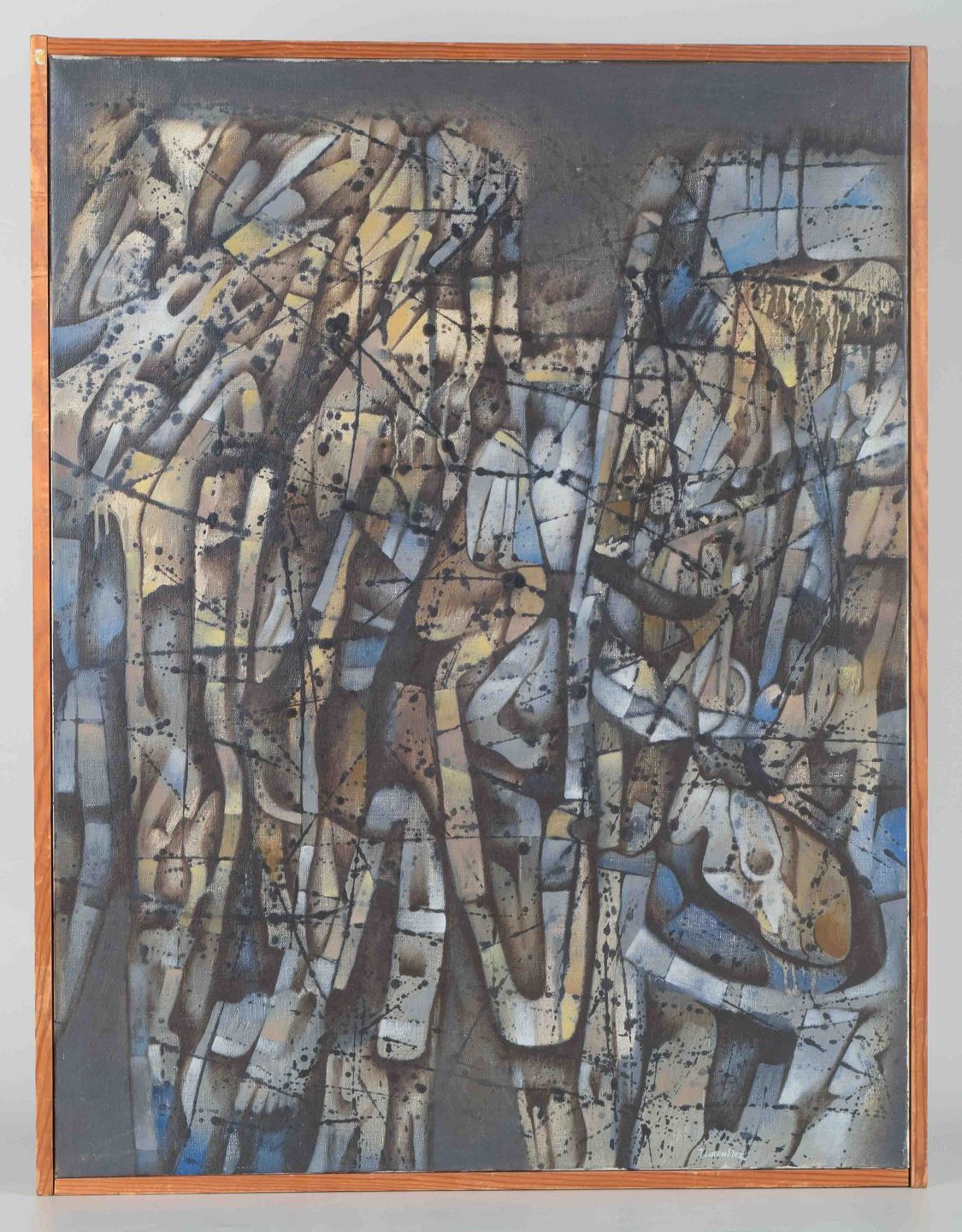 Et ekspressivt og komplekst abstrakt maleri, hvor figurlige og organiske former flettes ind i et rytmisk netværk af linjer og farvefelter i blå, brune og gyldne nuancer. Værket bærer præg af Lacomblez’ særlige surrealistisk-abstrakte billedsprog og hans optagethed af det mytologiske og det drømmende.