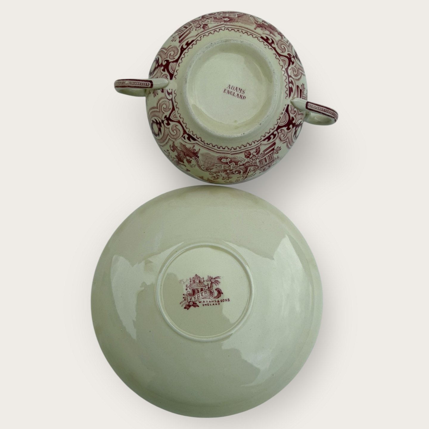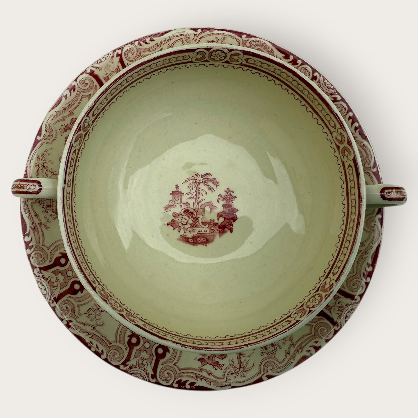 | William Adams, Kyber med rødt kinesisk motiv, Bouillonkop, Kop diameter 12cm, underkop17cm, pæn brugt stand.
