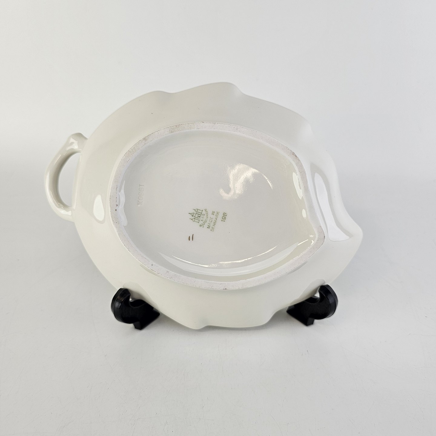 Kaktus er cremefarvet porcelæn i skælform, dekoreret med kaktusblomster og guldkant