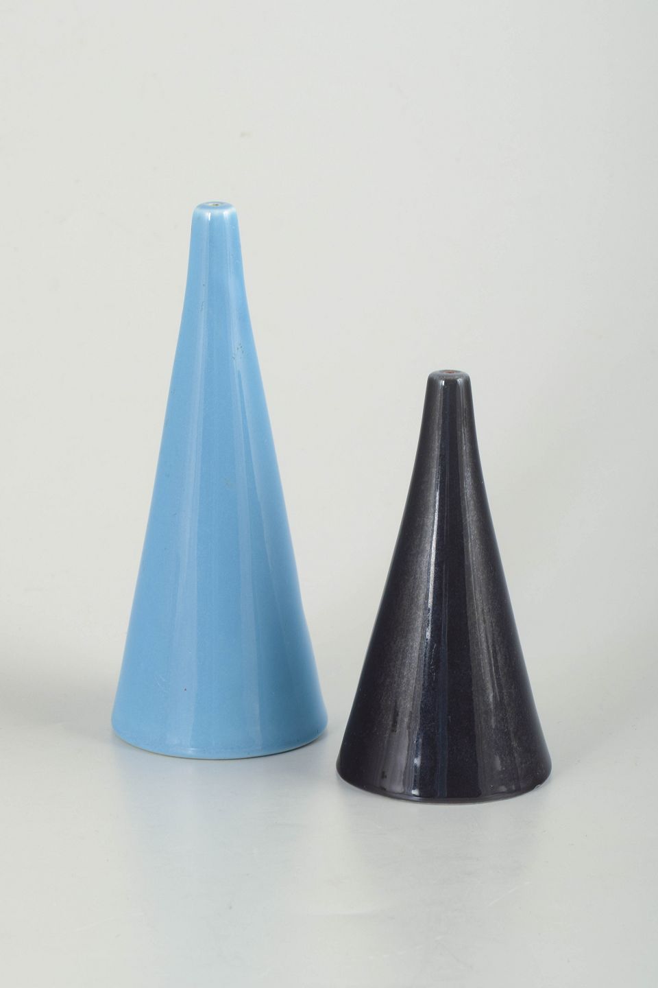 Pair of conical salt and pepper shakers in glazed faience, with blue and black glaze.