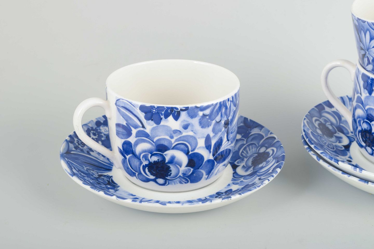 Porcelæn med håndmalet blomstermotiv i blå toner.
