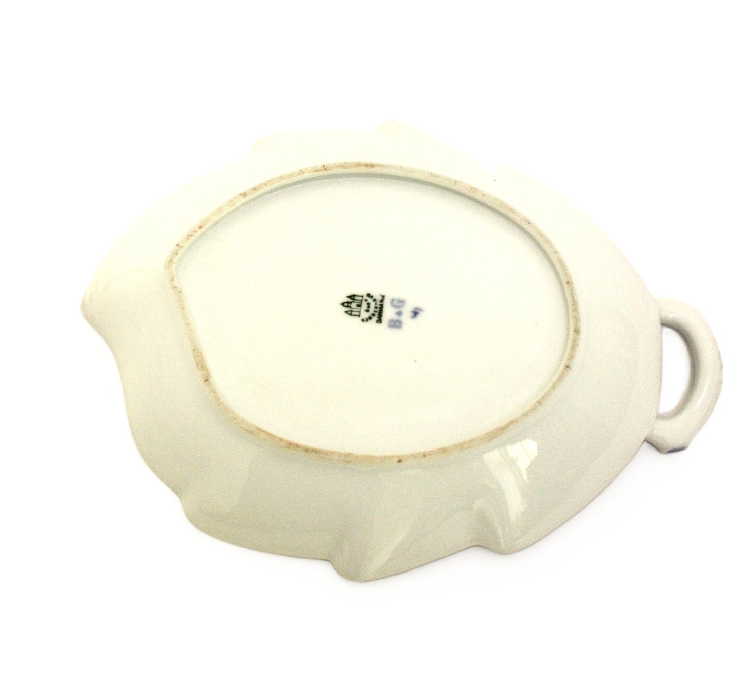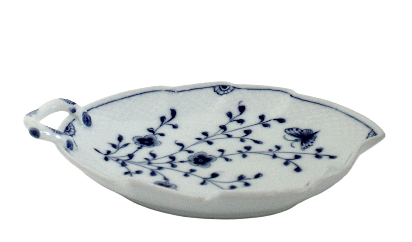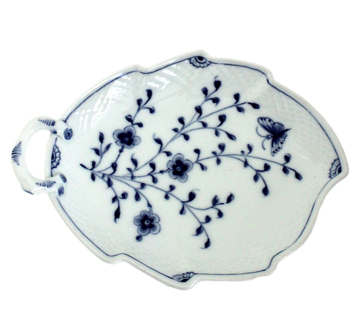 ing & Grøndahl, Sommerfugl. Bladassiet, småkagefad med hank. Længde 24,5 cm. Højde 3,5 cm. Produceret i perioden 1915-1948. III. sortering. Flot stand med bobler i glasuren som er typisk for den tid. Pris: 375 kr. stk. Lager: 1