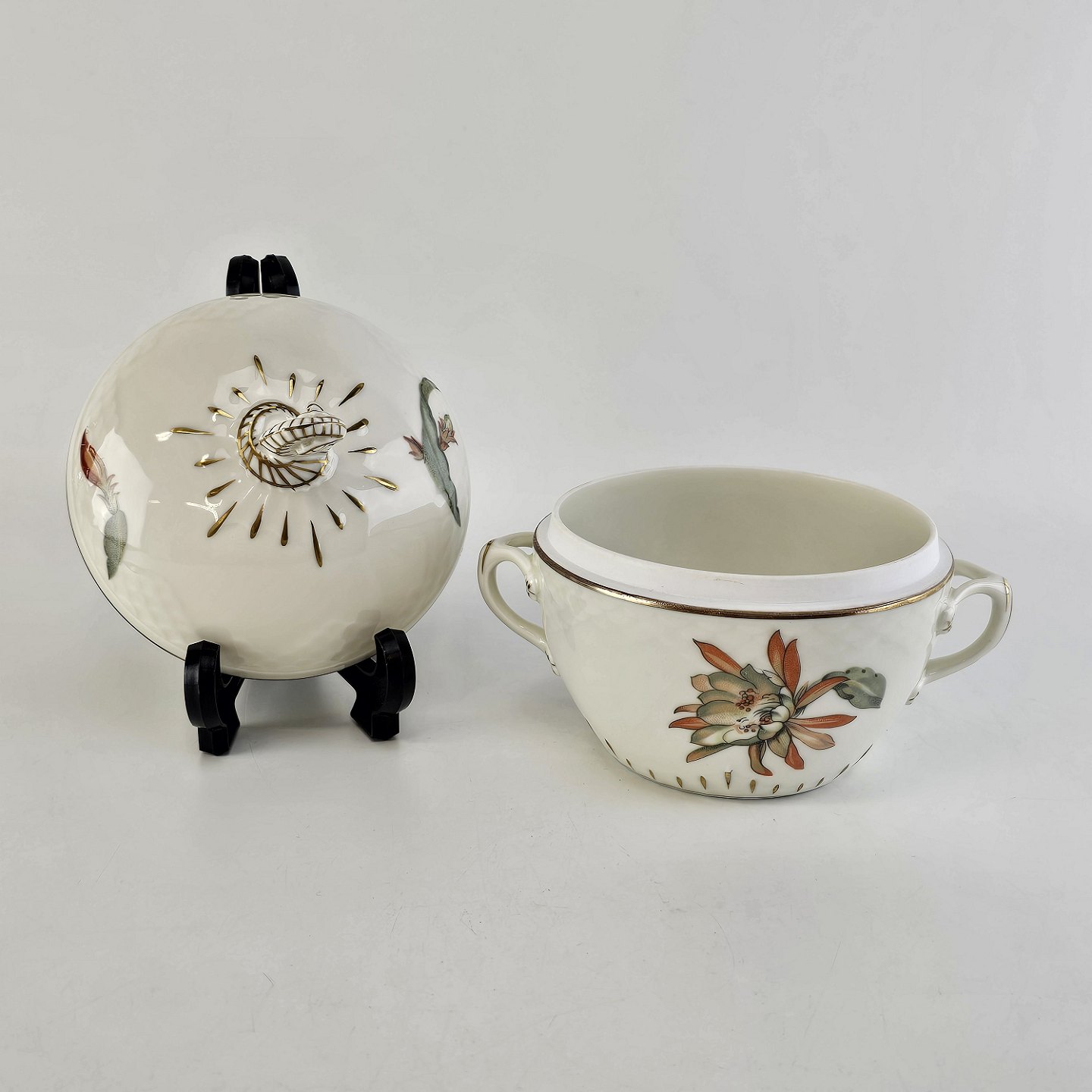 Kaktus er cremefarvet porcelæn i skælform, dekoreret med kaktusblomster og guldkant