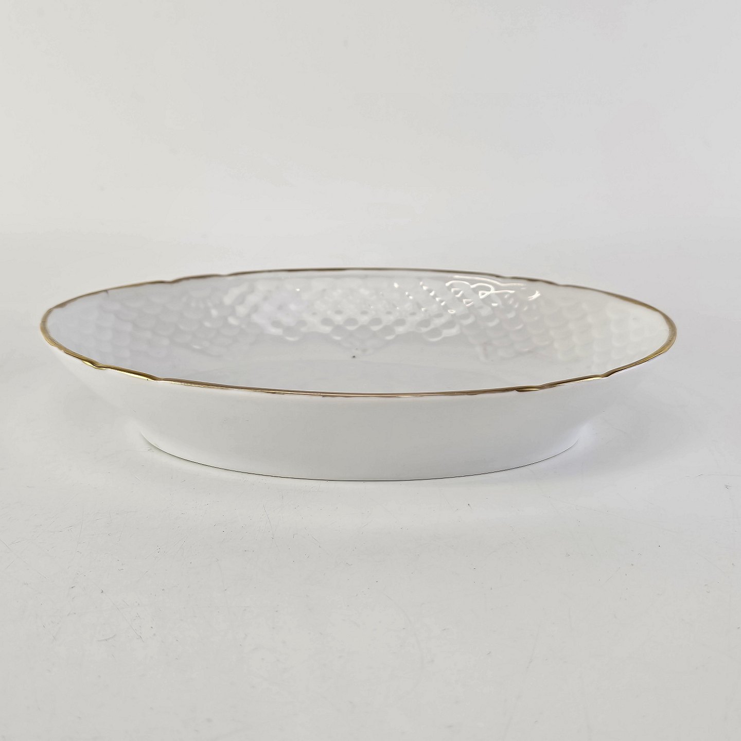 Hostrup er hvidt porcelæn i skælform med guldkant