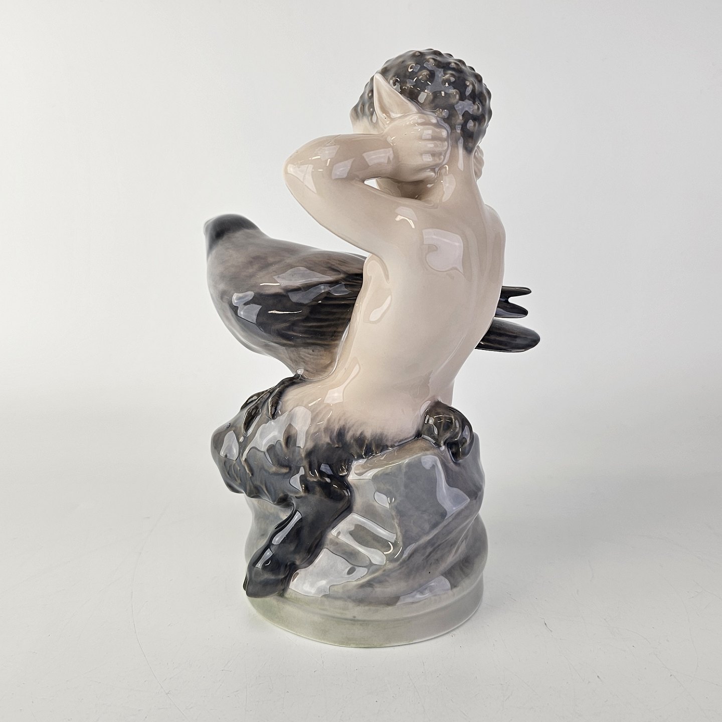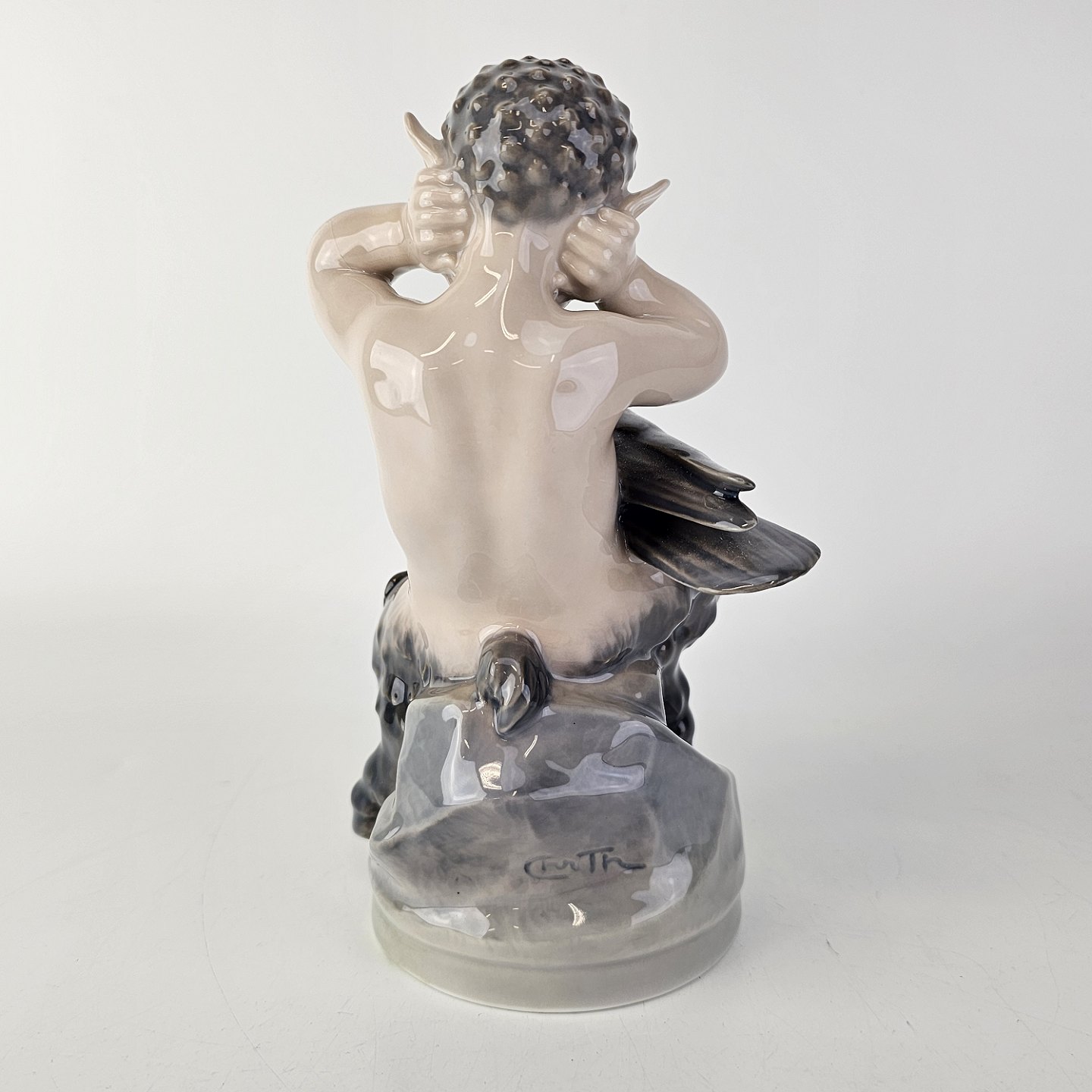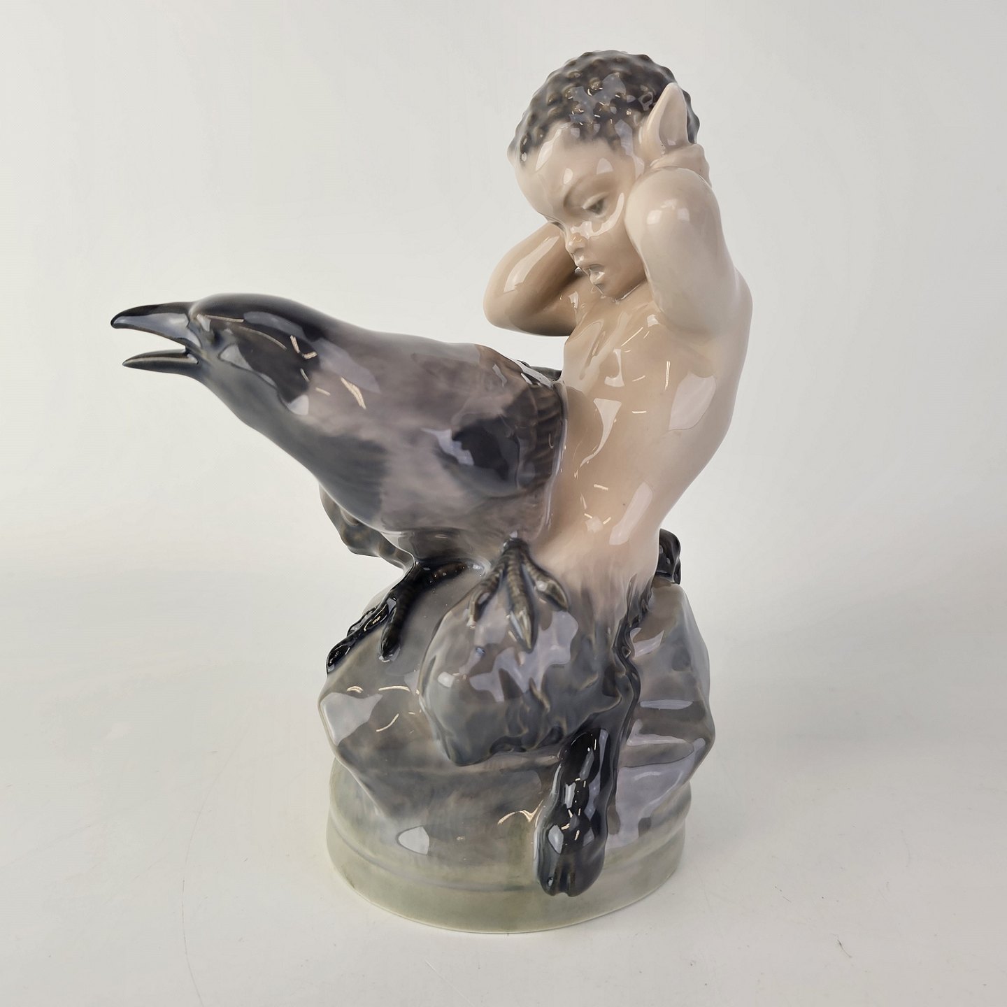Figur af porcelæn med motiv af en faun som holder sig for ørerne med en krage i skødet