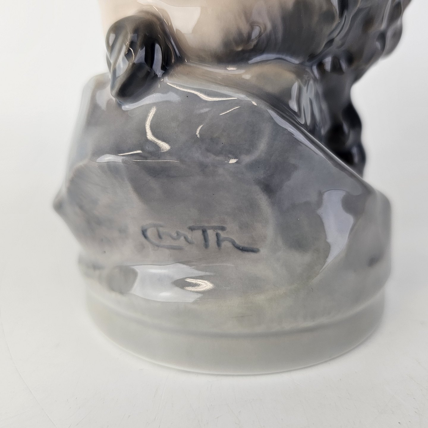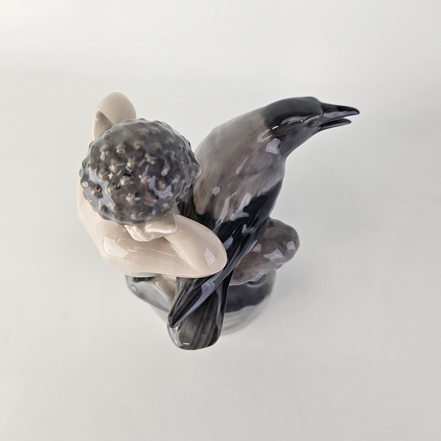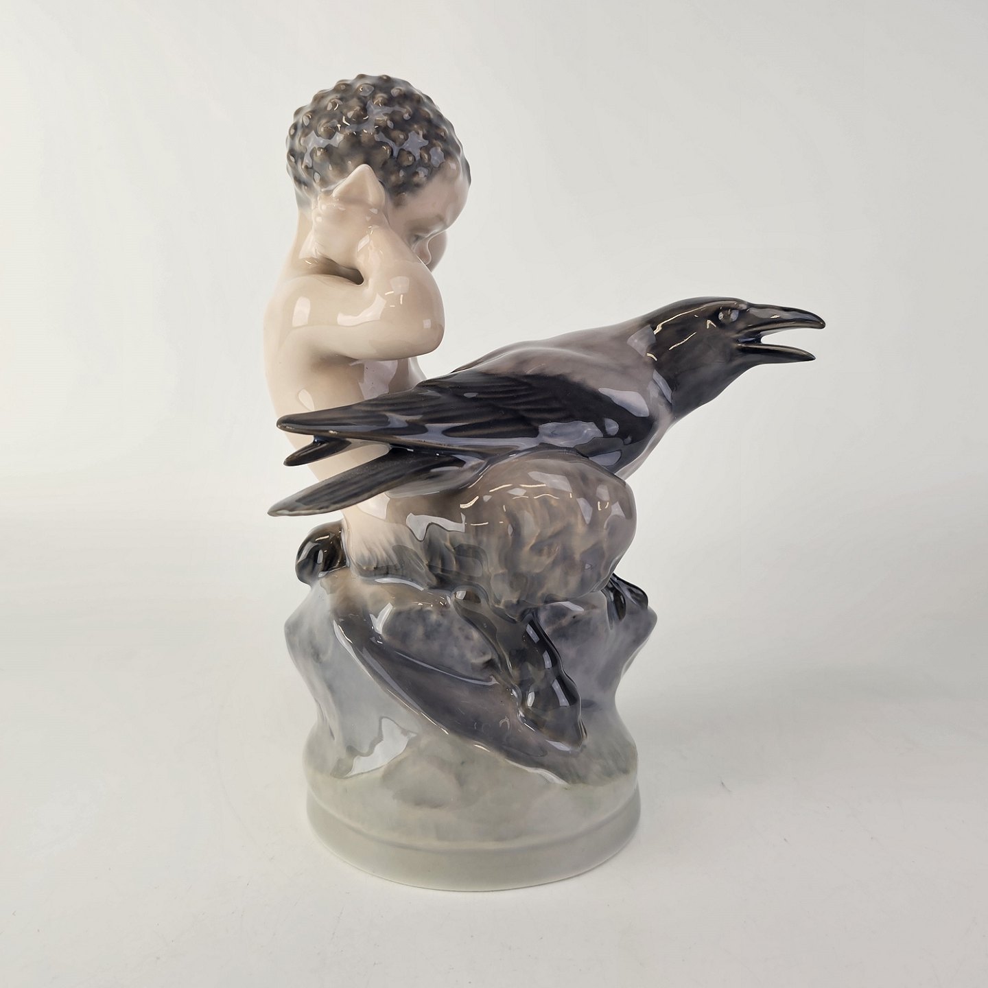 Figur af porcelæn med motiv af en faun som holder sig for ørerne med en krage i skødet