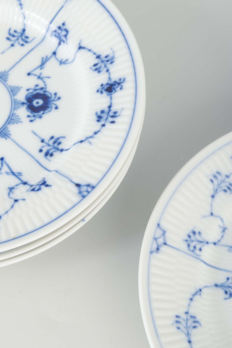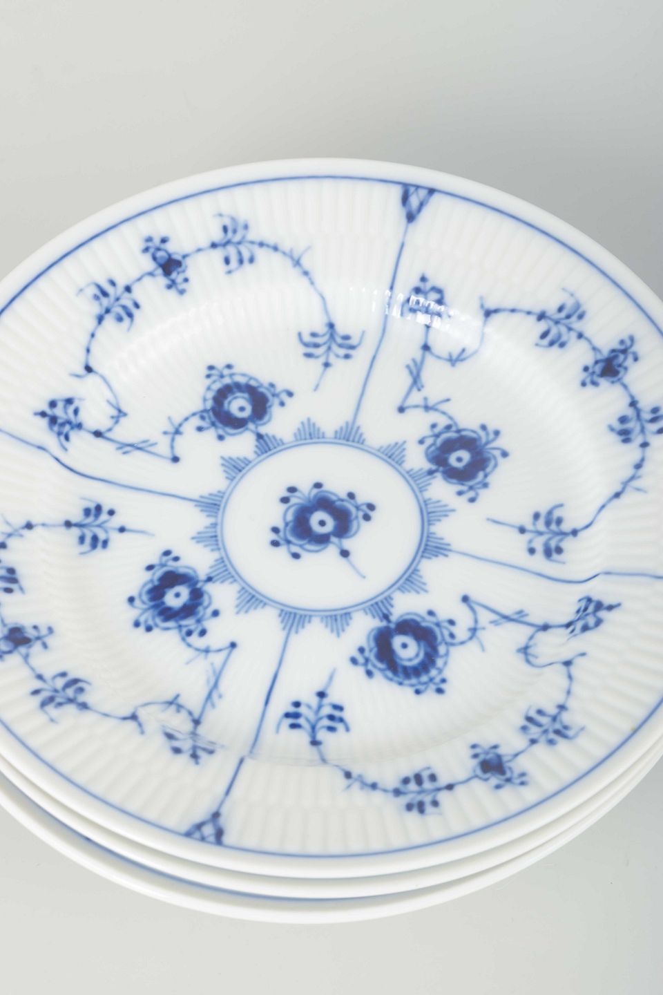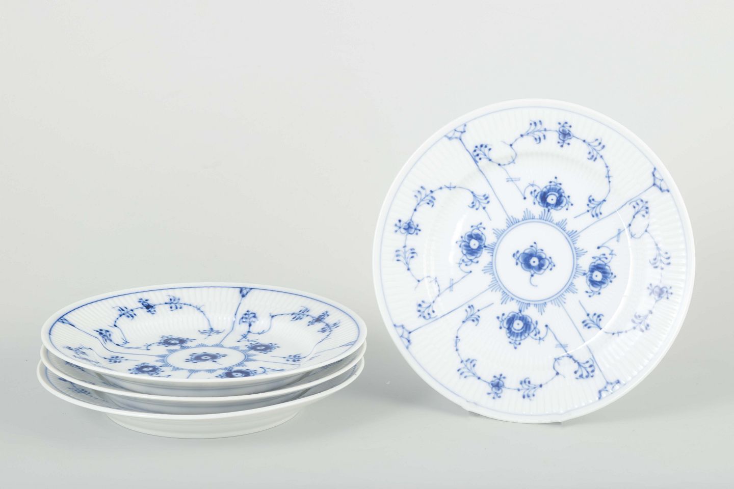 Sæt af fire flade tallerkener i porcelæn, dekoreret i musselmalet riflet mønster i blå underglasur.