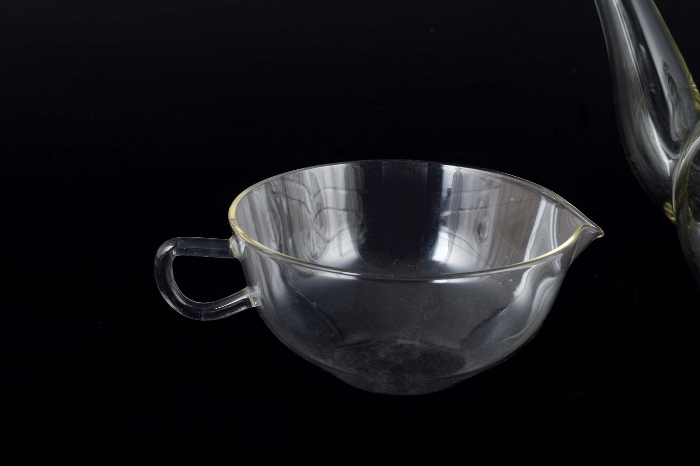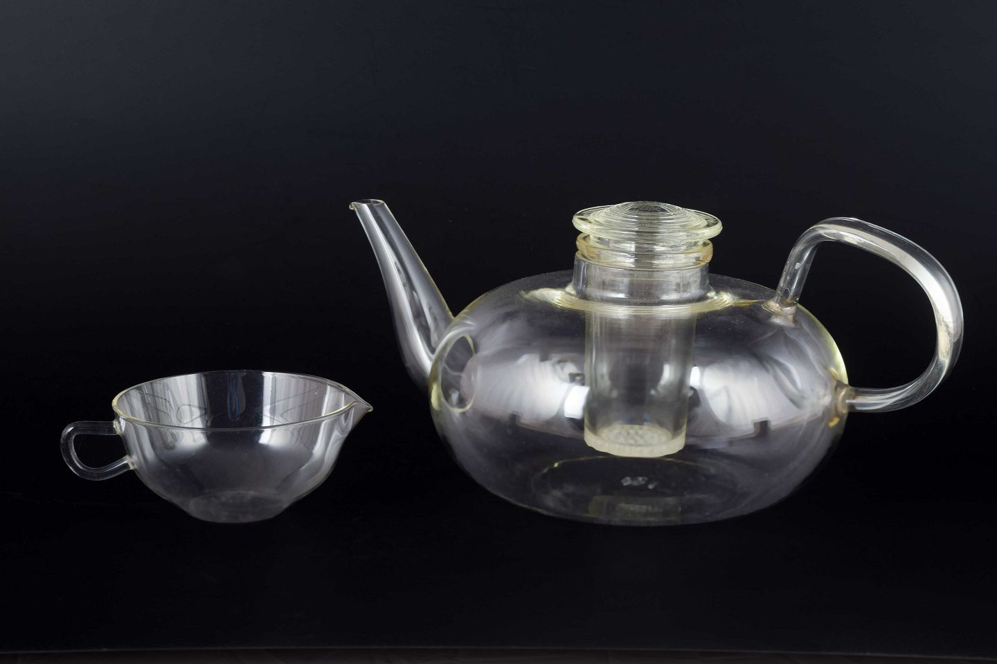 Bauhaus-inspireret tekande med integreret tesi samt matchende flødekande. Fremstillet i varmefast borosilikatglas (Jenaer Glas).