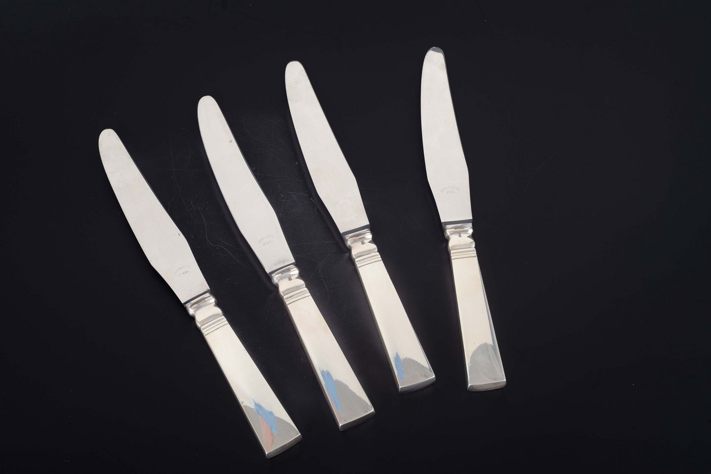 Sæt bestående af 4 middagsknive i det elegante “Blok / Acadia”-mønster, designet af Harald Nielsen i 1918. Knivene har sterlingsølvskafter kombineret med lange klinger i rustfrit stål. Designet er et klassisk eksempel på Art Deco-stilen med funktionalistiske linjer og geometriske proportioner.
