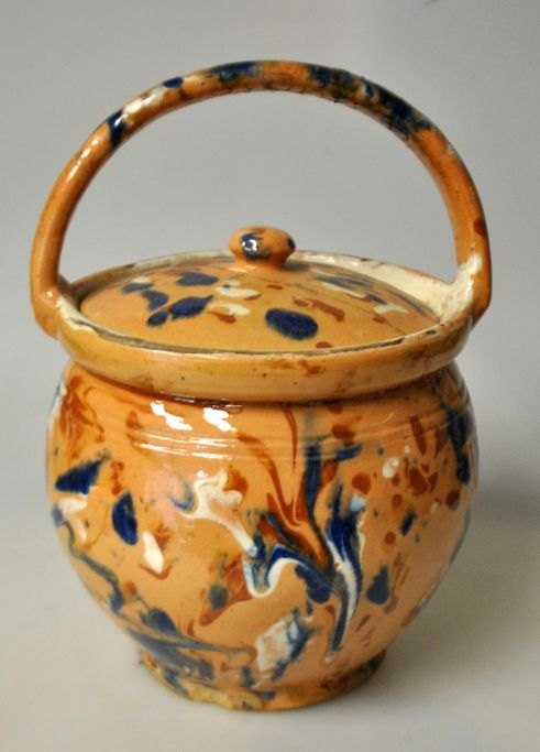 Small Danish maternity bucket, 19th century. Red clay with glaze in blue, white and red colors. With handle and lid. H: 21 cm.
